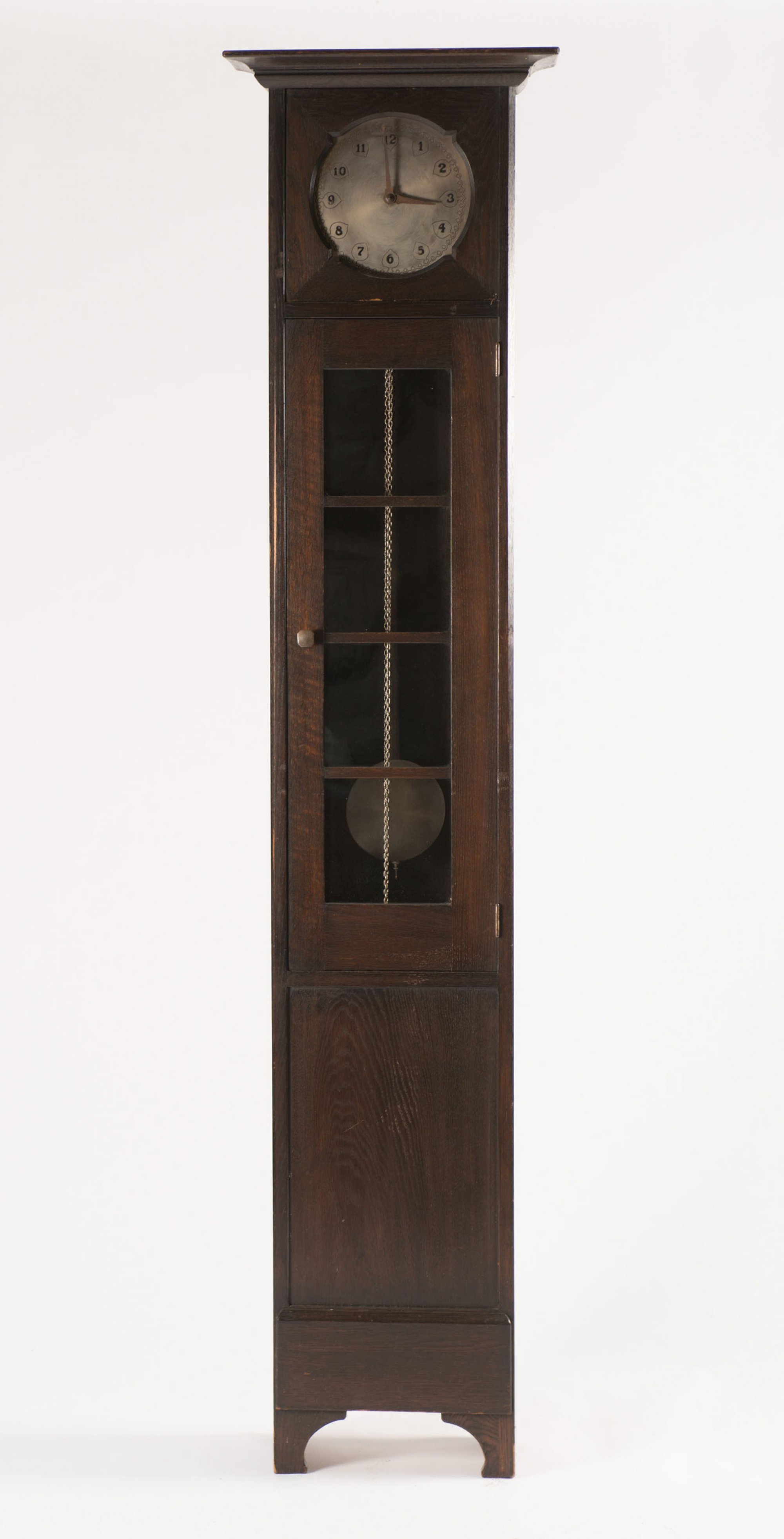 Richard Riemerschmid. Grandfather clock, 1908. H. 205 cm, 35 x 22 cm. Made by Deutsche Werkstätten, Hellerau. Oak, stained dark. Glass pane, iron fittings, iron hands. Coil chime. Pendulum, two weights. Marked: Universal (badge).