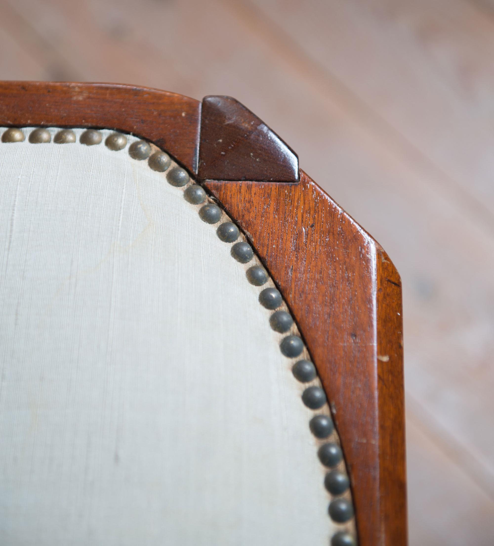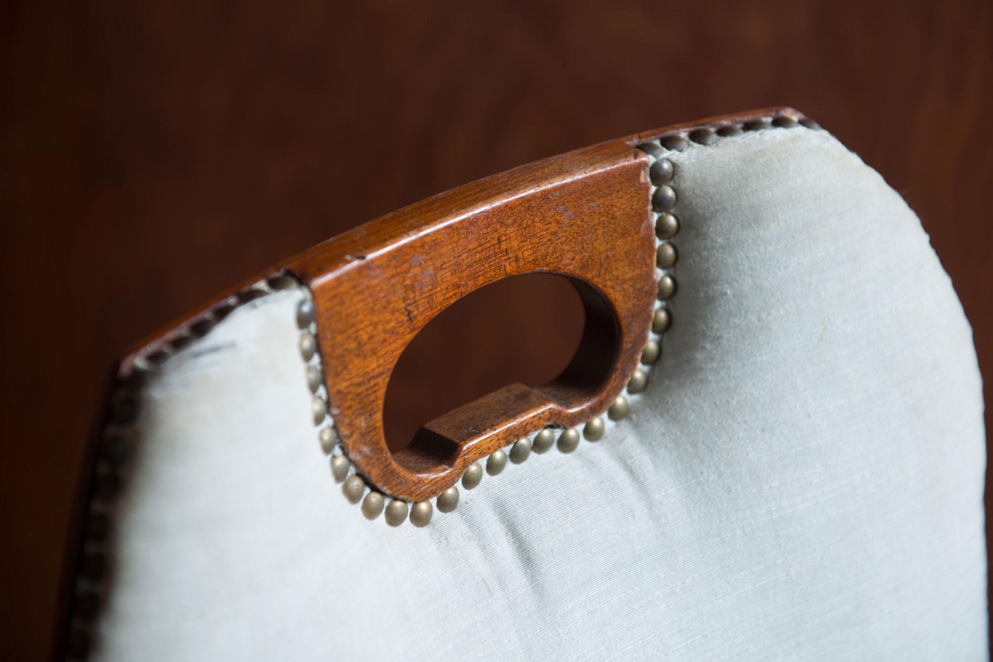 Richard Riemerschmid. Chair, 1904. H. 95.3 cm, 42.5 x 56.5 cm. Made by Dresdener Werkstätten, Hellerau. Mahogany, white silk, bullen-nails.