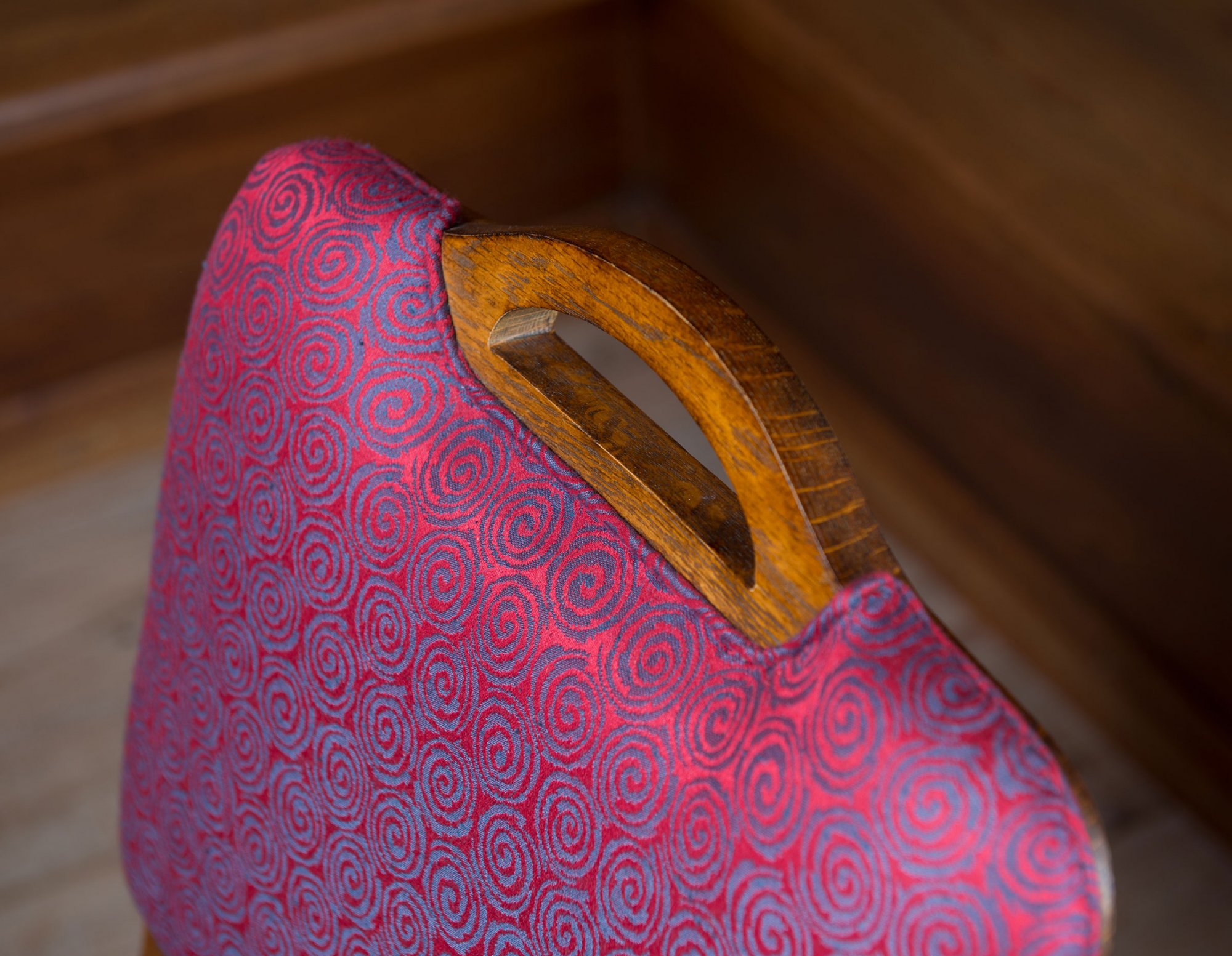 Richard Riemerschmid. Four 'II' chairs, 1904-06. H. 90 cm, 45.5 x 50 cm. Made by Dresdener Werkstätten, Hellerau. Oak, iron nails, fabric upholstery.