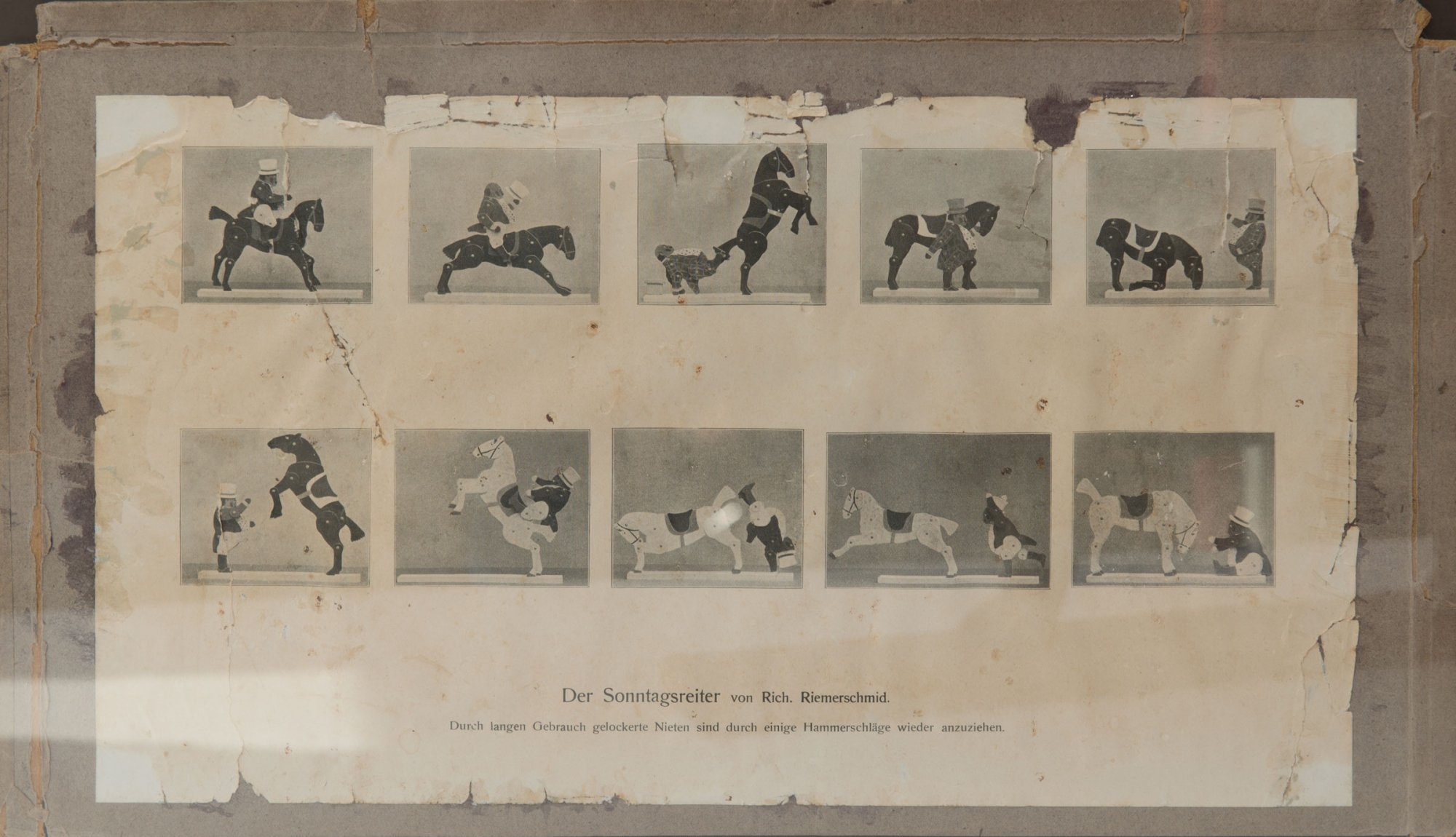 Richard Riemerschmid. Horse and rider, c1904. H. 32 cm, 39.4 x 7.3 cm. Painted wood, metal nails. With: Cardboard cover: ten images depicting different positions of the rider on paper. Glass frame.
