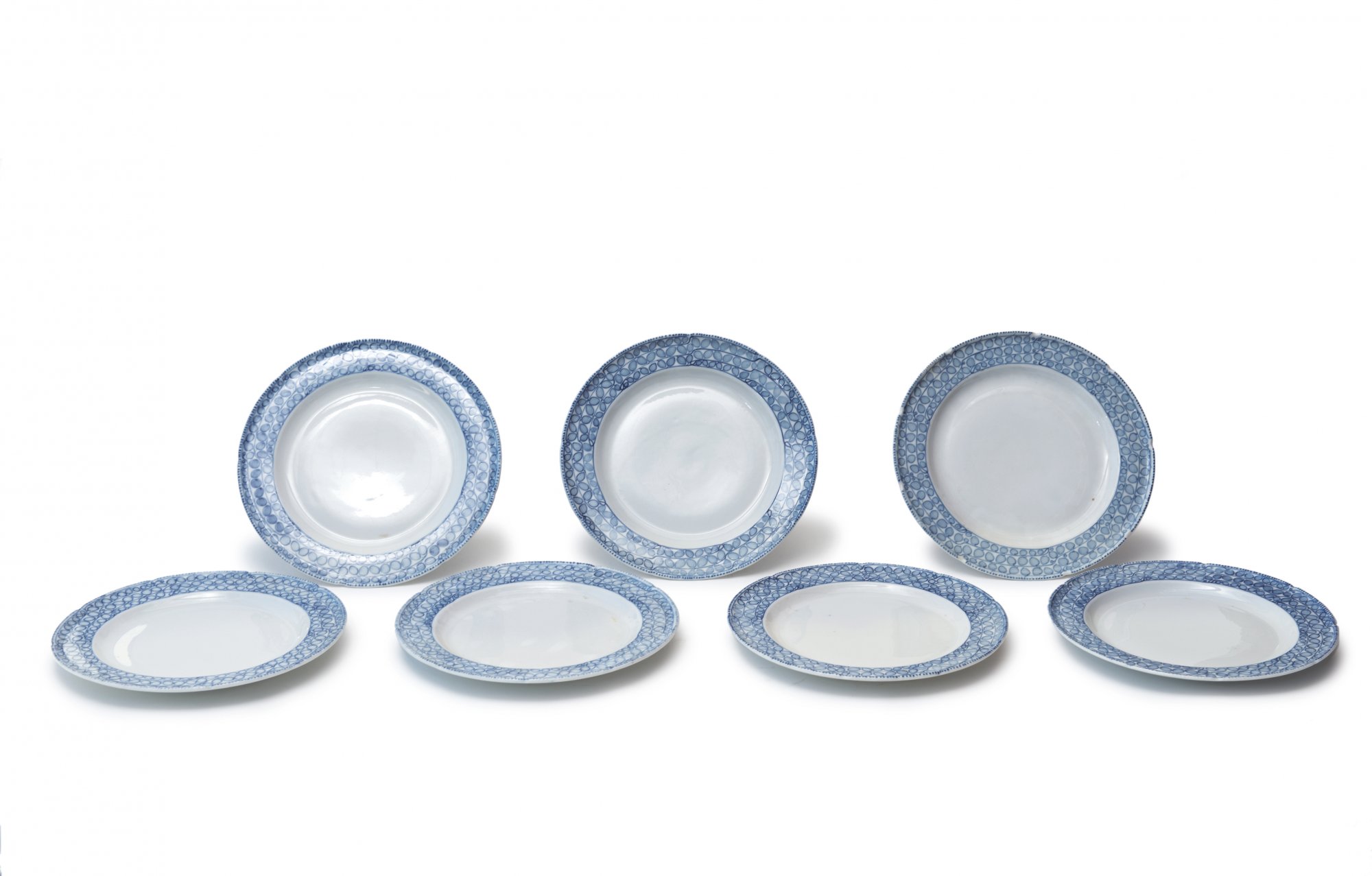 Richard Riemerschmid. Seven dining plates, 1903-05. D. 26 cm. Made by StPM Meissen. Porcelain, white, glazed, blue underglaze. Marked: Maker's mark (two strokes), 82 1601.