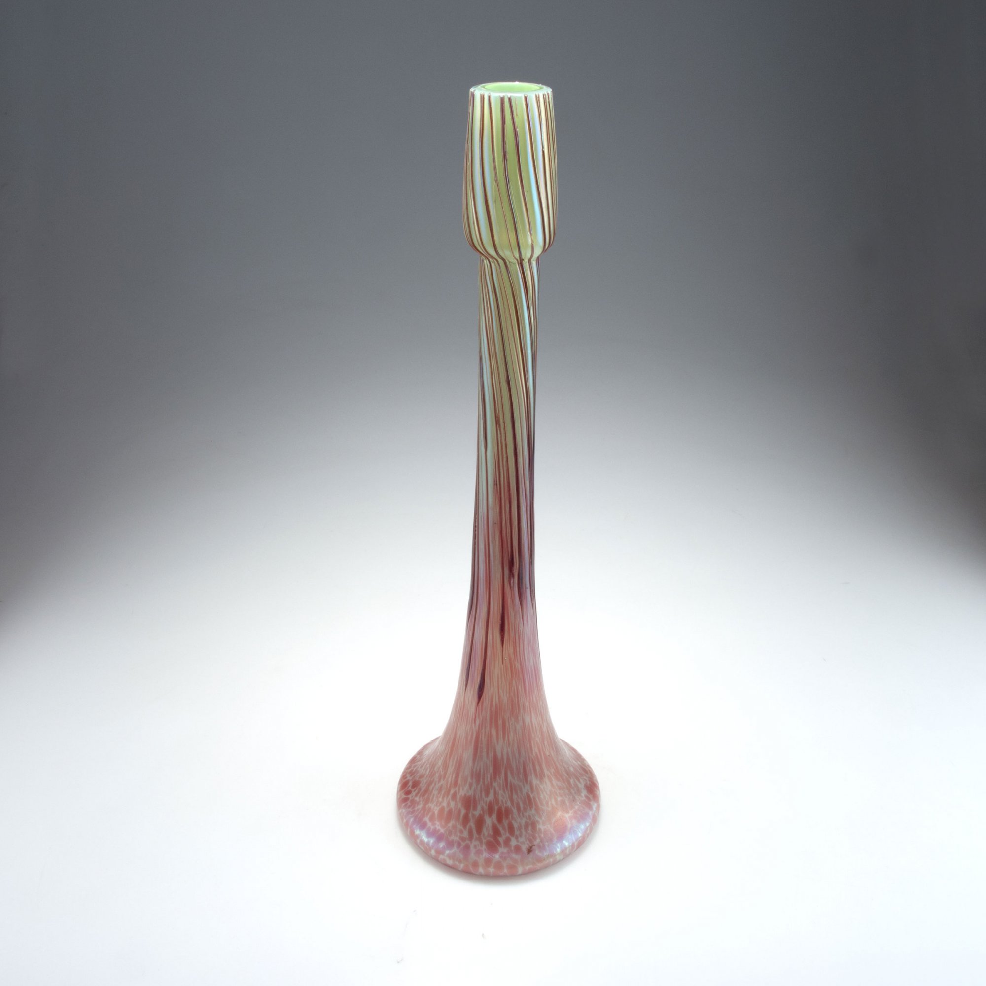 Elisabeth Glassworks, Pallme-König & Habel, Kosten near Teplice. Tall vase, 1900-05. H. 53.5 cm. Cased glass, green, opal white and clear, crushed pink glass, clear/red threads, lustre.