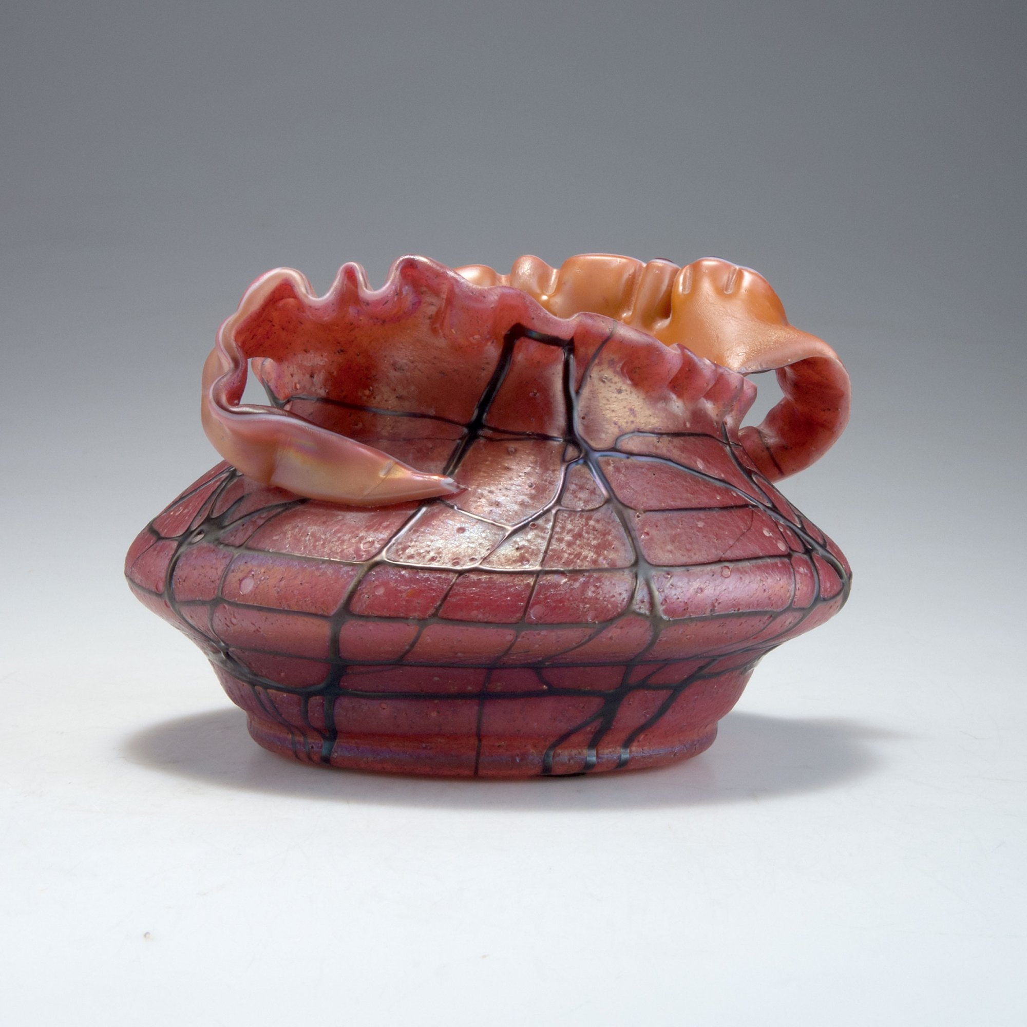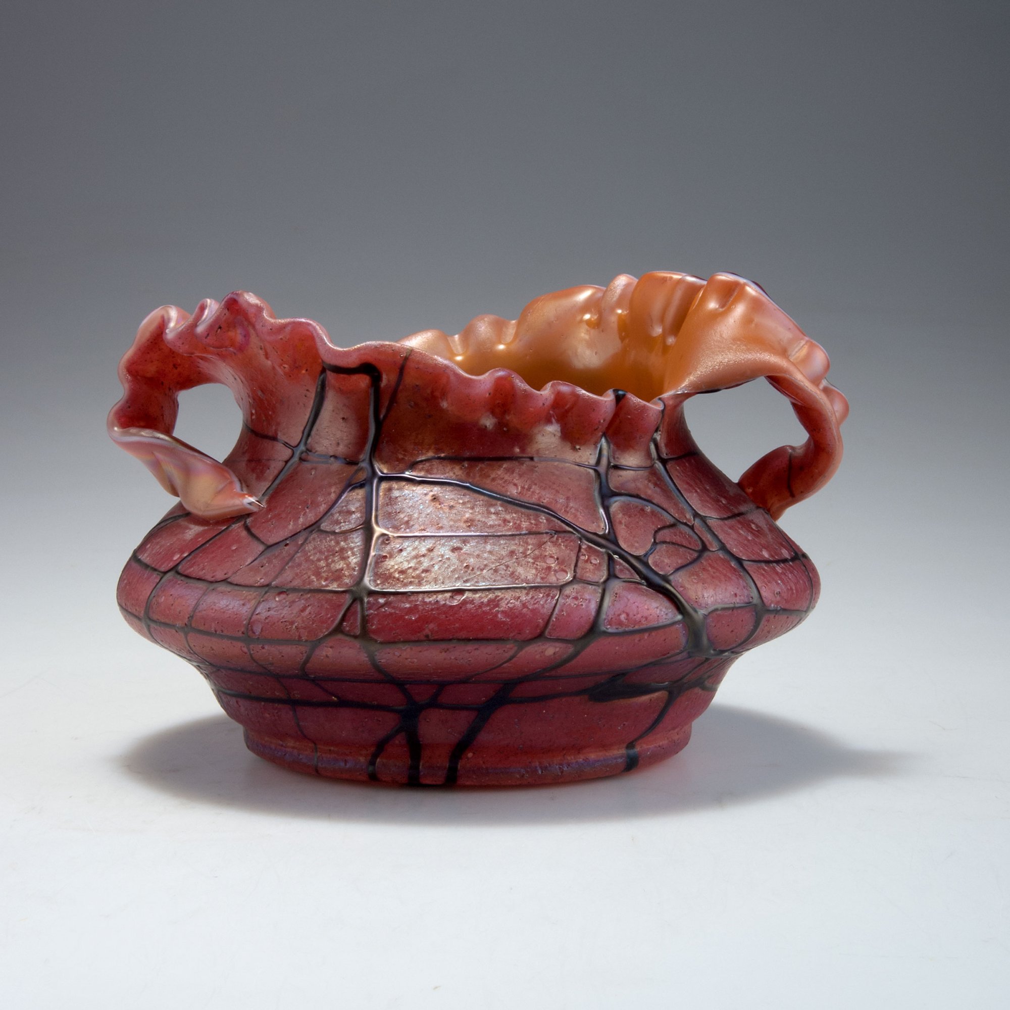 Elisabeth Glassworks, Pallme-König & Habel, Kosten near Teplice. Vase, 1900-03. H. 14.7 cm, D. 20 cm. Cased glass, brown and opal white, red powder fusions, dark purple threads, lustre.