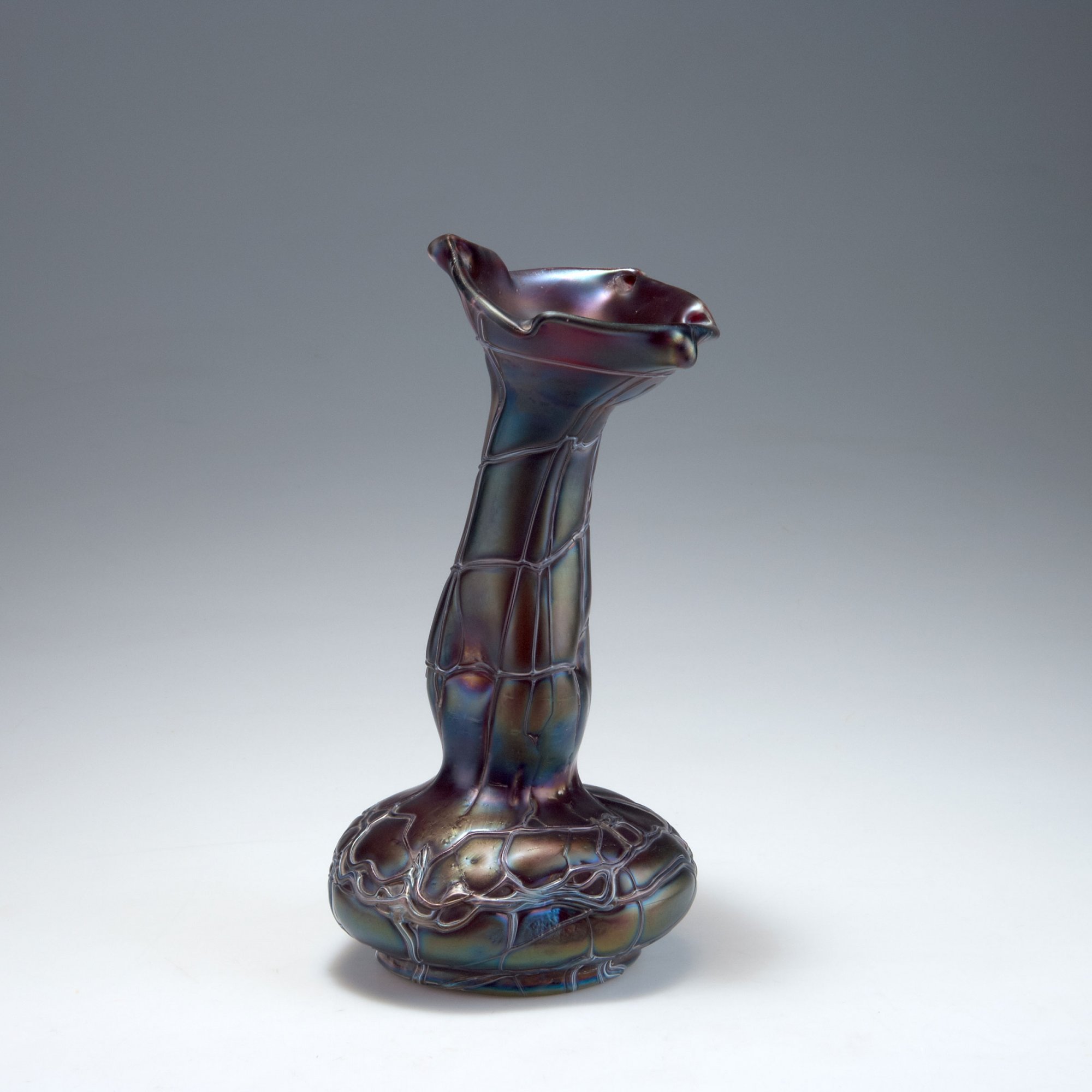 Elisabeth Glassworks, Pallme-König & Habel, Kosten near Teplice. Vase, 1900-03. H. 25.7 cm. Cased glass, clear and ruby red, clear, white and red threads, matt lustre.