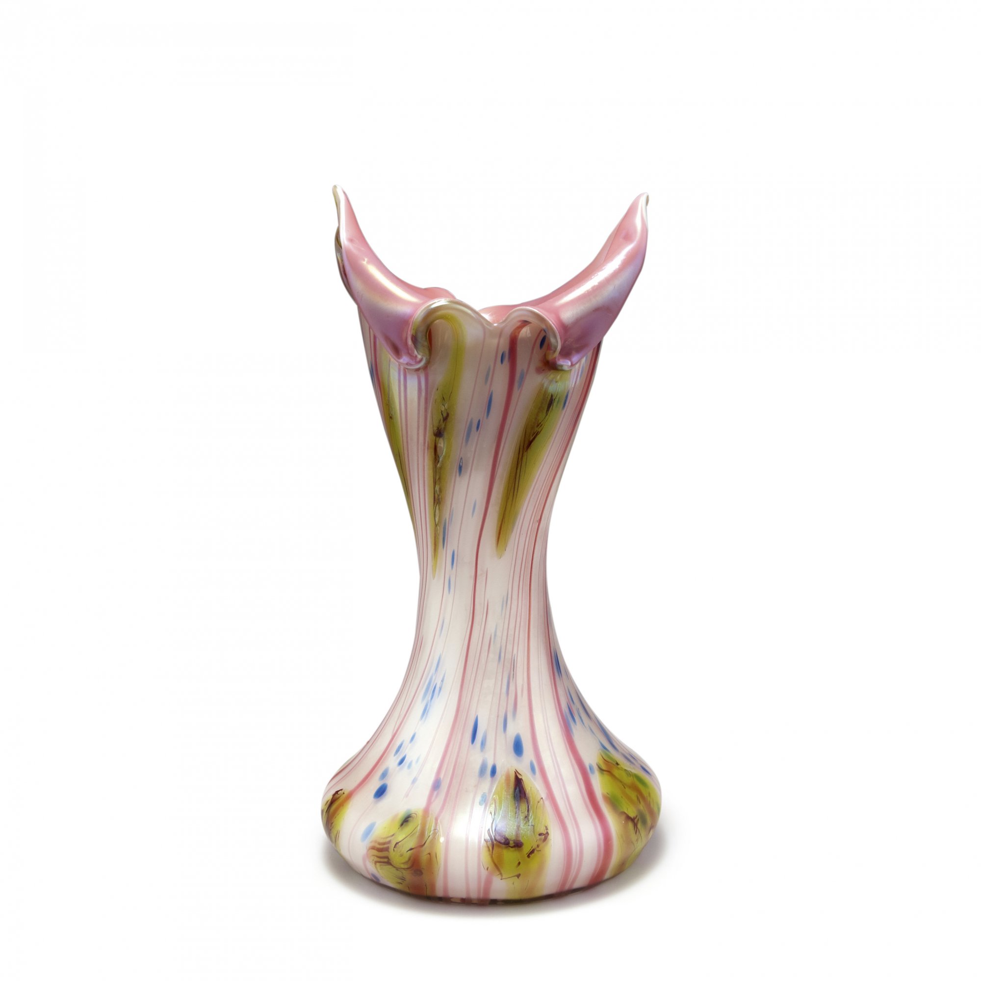 Elisabeth Glassworks, Pallme-König & Habel, Kosten near Teplice. Vase, 1900-05. H. 33.7 cm. Cased glass, opal white and salmon pink, pink threads, crushed blue glass, green/red batches, matt lustre.