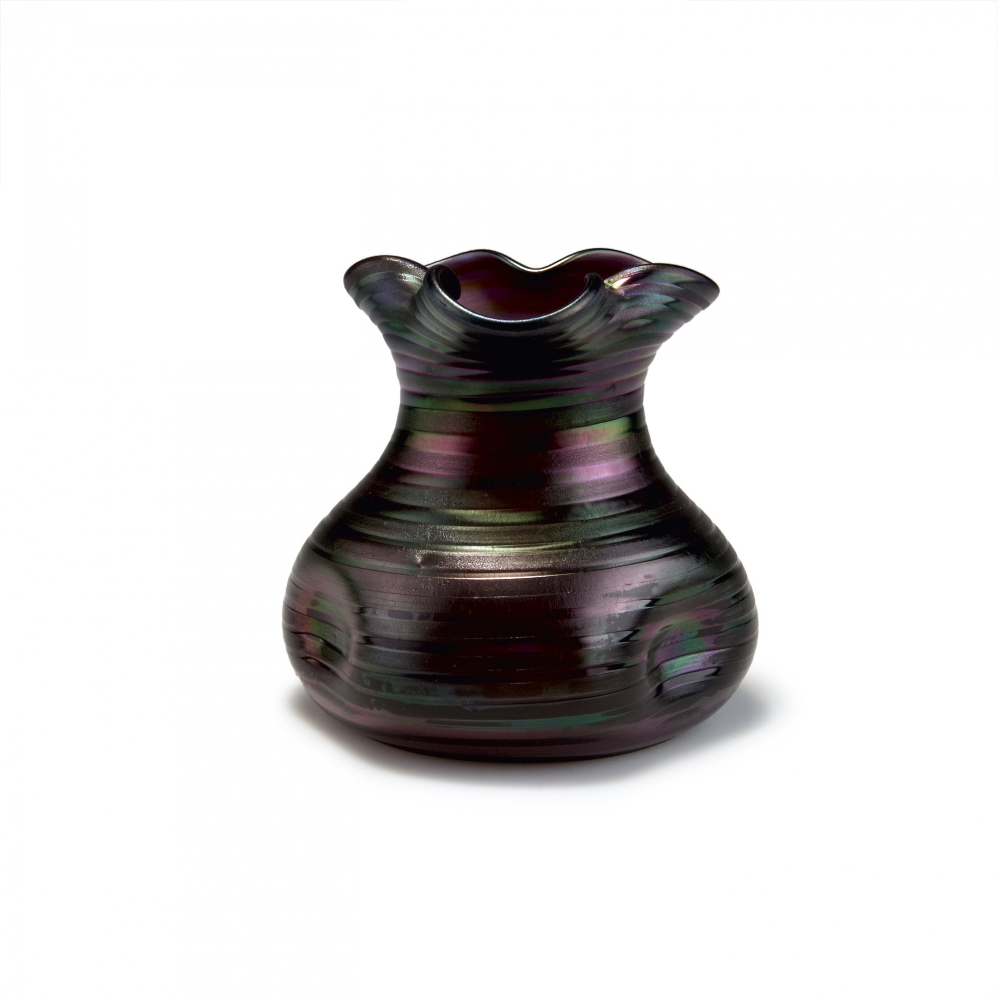 Elisabeth Glassworks, Pallme-König & Habel, Kosten near Teplice. Vase, 1900-10. H. 11.8 cm. Purple glass, yellow threads, lustre.
