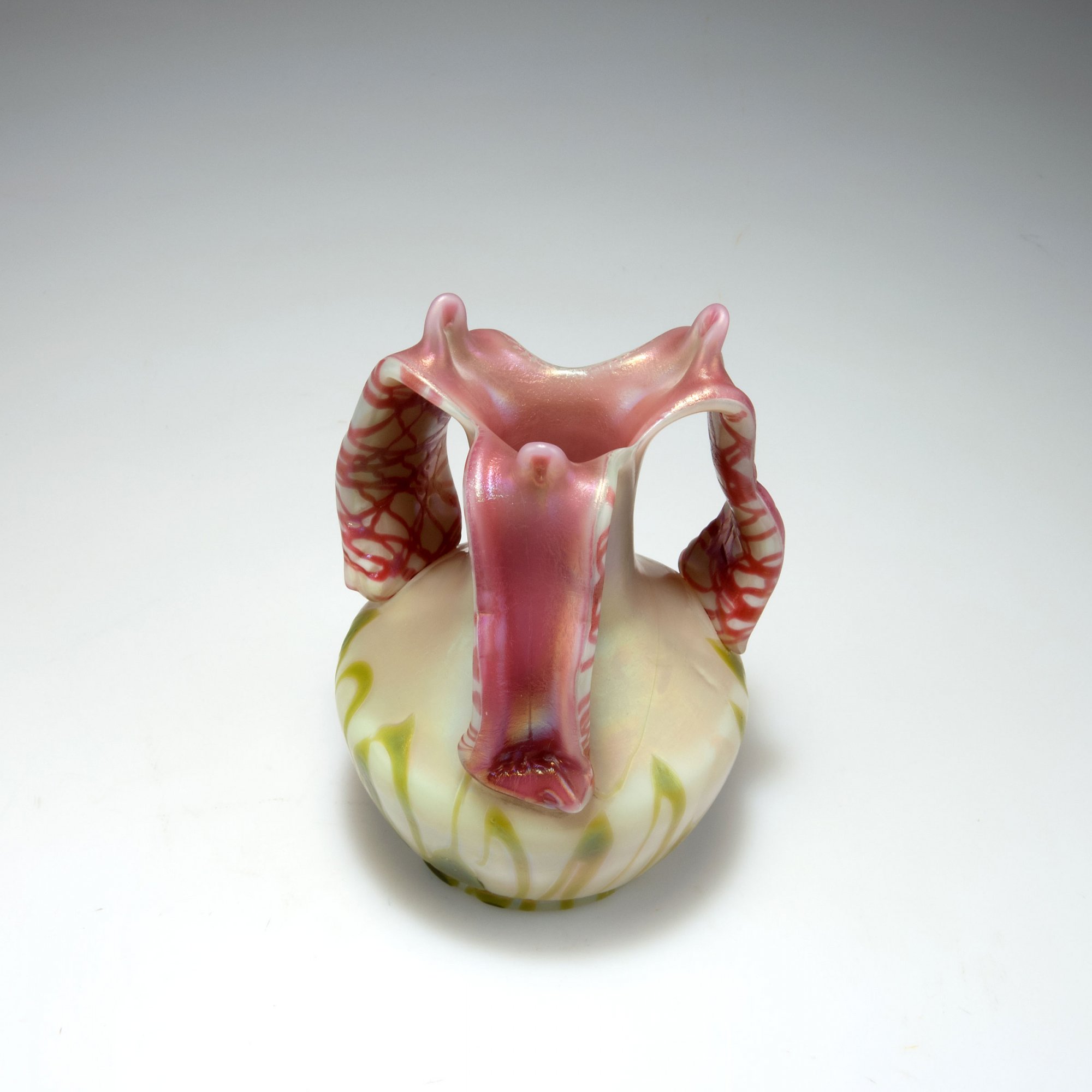 Elisabeth Glassworks, Pallme-König & Habel, Kosten near Teplice. Vase with handles, 1900-05. H. 18.8 cm. Cased glass, opal pink, opal white and clear, yellow/green threads, handles with dark pink threads, matt mother of pearl lustre.