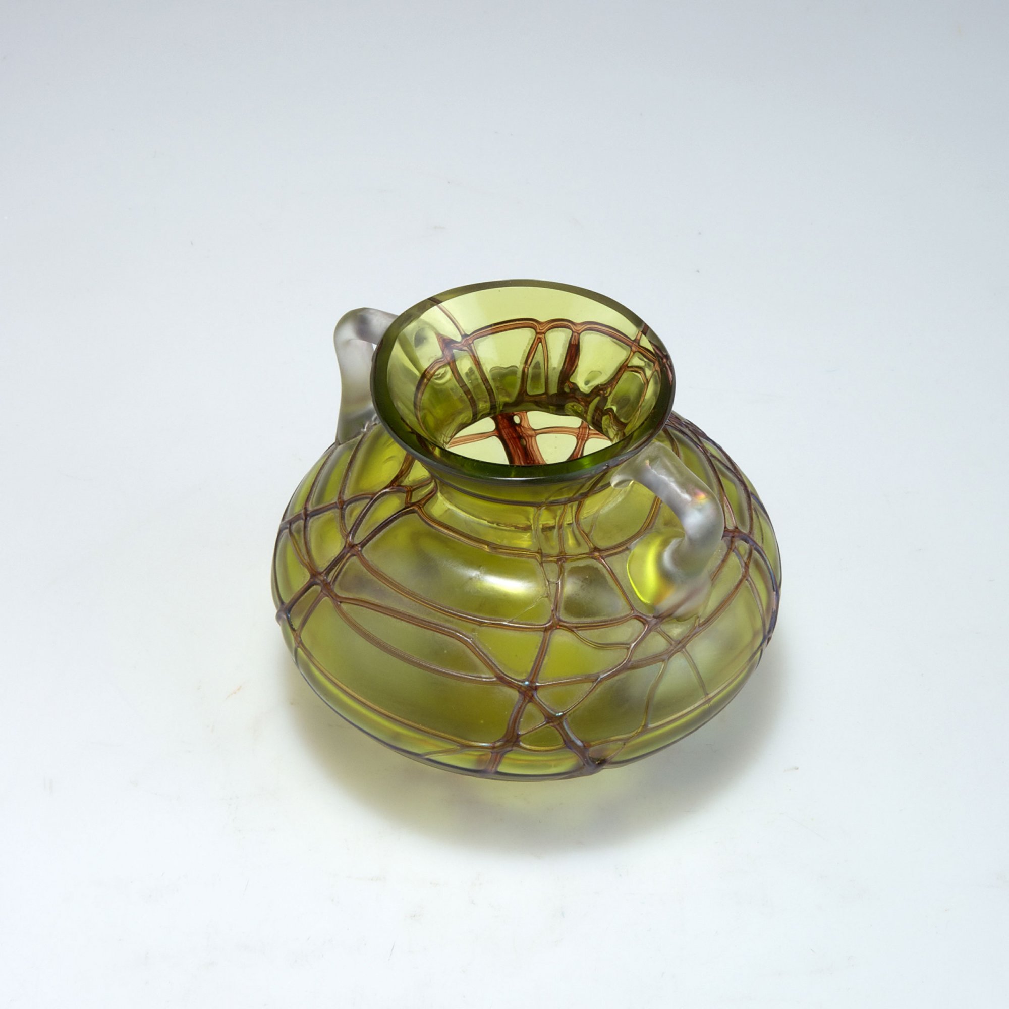 Elisabeth Glassworks, Pallme-König & Habel, Kosten near Teplice. Vase with handles, 1900-05. H. 16.2 cm. Cased glass, orange, pink and clear, crushed pink glass, combed threads, lustre.
