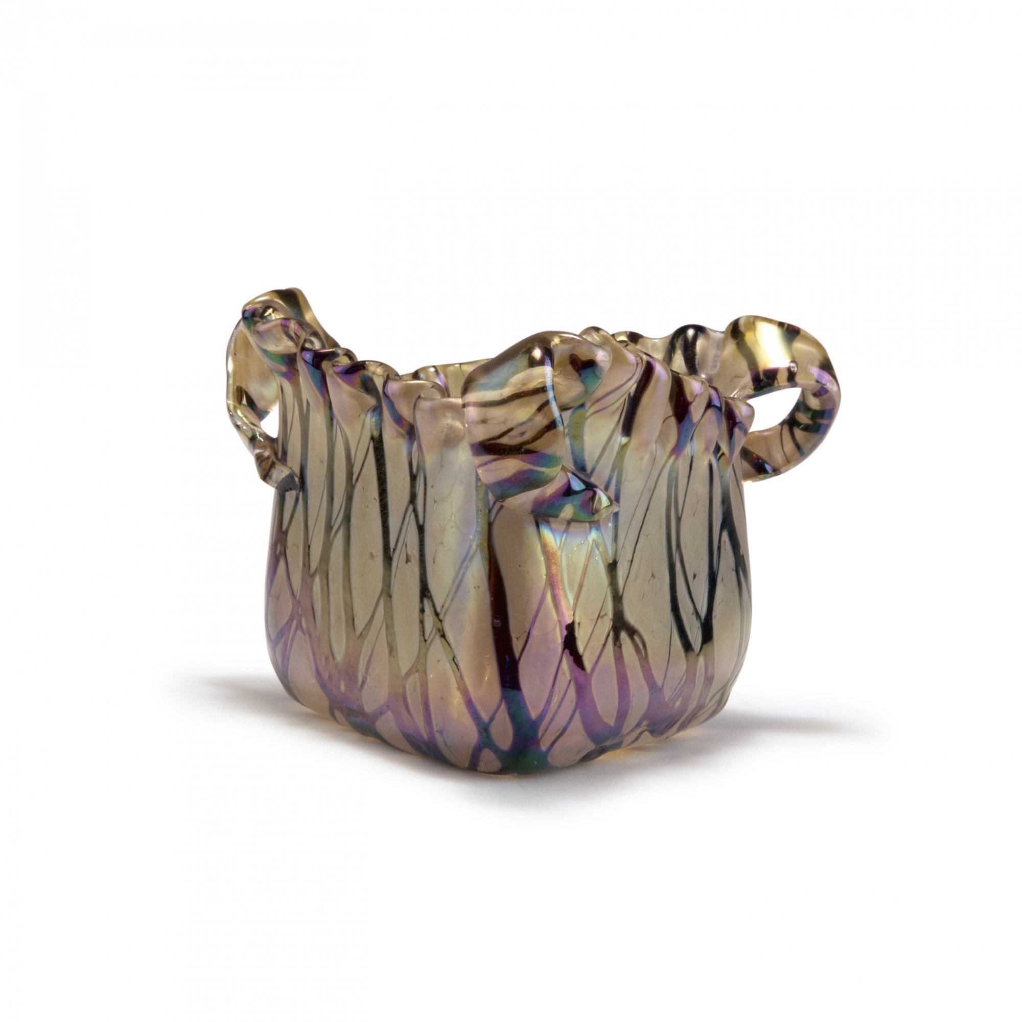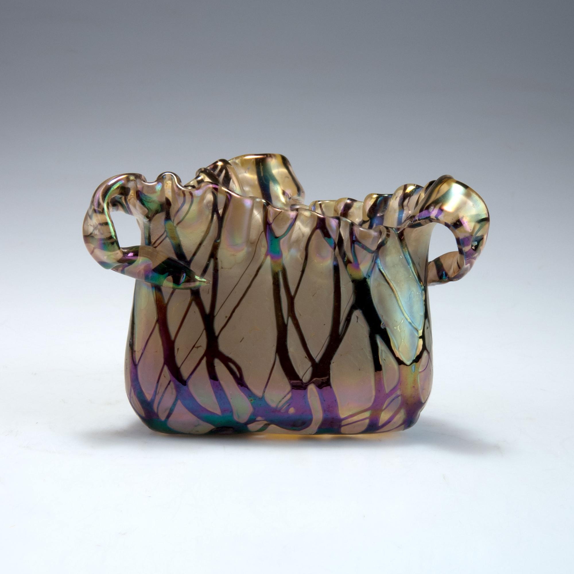 Elisabeth Glassworks, Pallme-König & Habel, Kosten near Teplice. Vase with handles, 1900-05. H. 9.7 cm. Clear glass, crushed silver-yellow glass, dark purple threads, lustre.