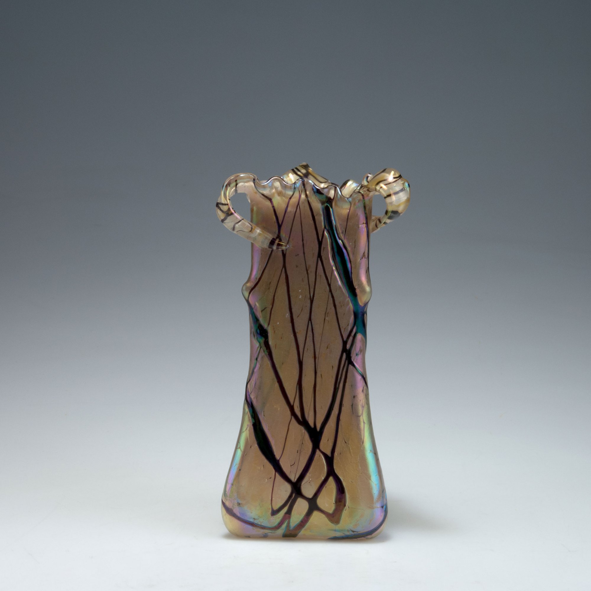 Elisabeth Glassworks, Pallme-König & Habel, Kosten near Teplice. Vase with handles, 1900-05. H. 21.9 cm. Clear glass, crushed silver-yellow glass, dark purple threads, lustre.