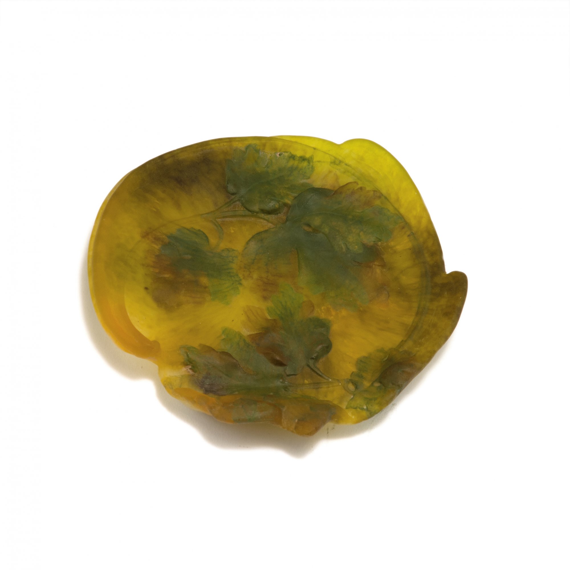 Daum Frères, Nancy. 'Feuilles de vigne' vide poches, 1905-10. 15.1 x 14.8 cm. Designed by Amalric Walter. Pâte de verre, translucid batch, moulded, yellow and amber, purple stripes. Powder fusions, green and brown. Vine. Signed: DAUM NANCY, cross of Lorraine.