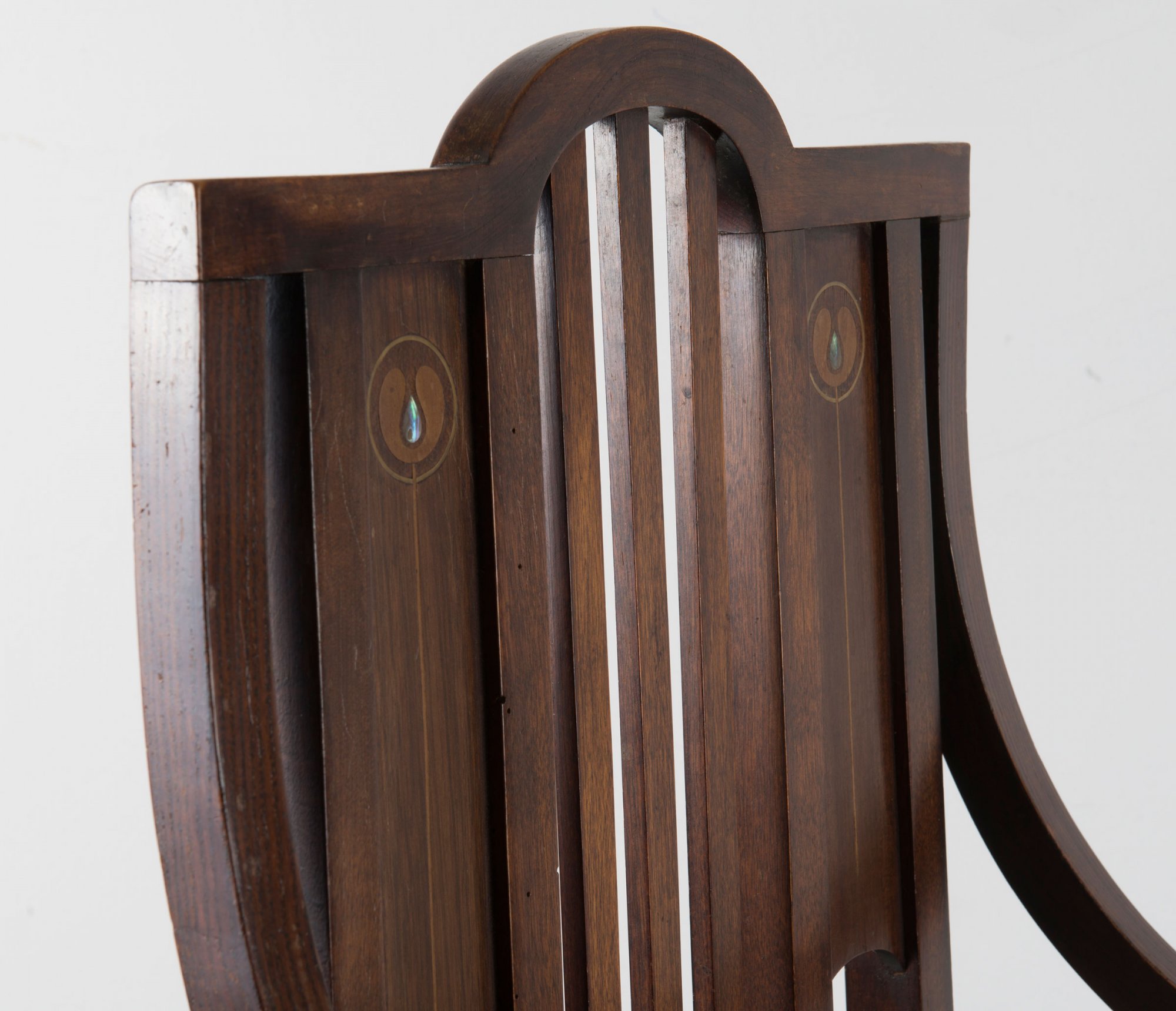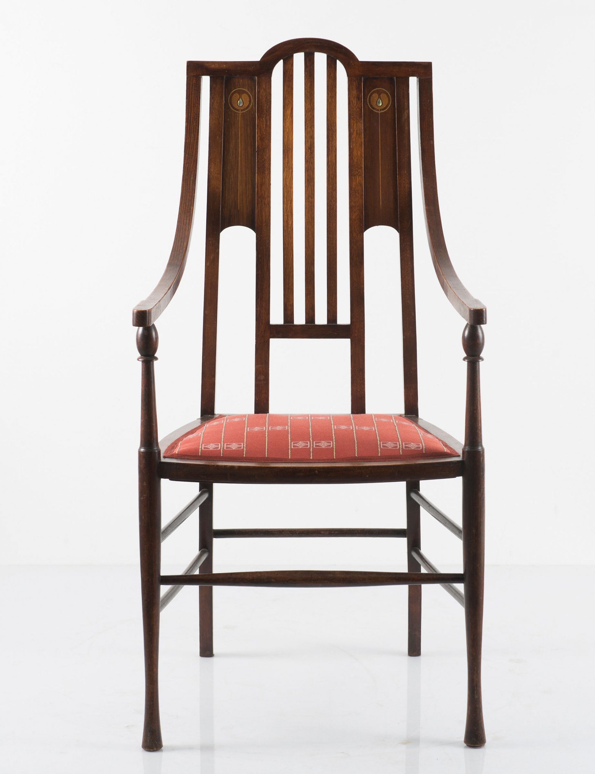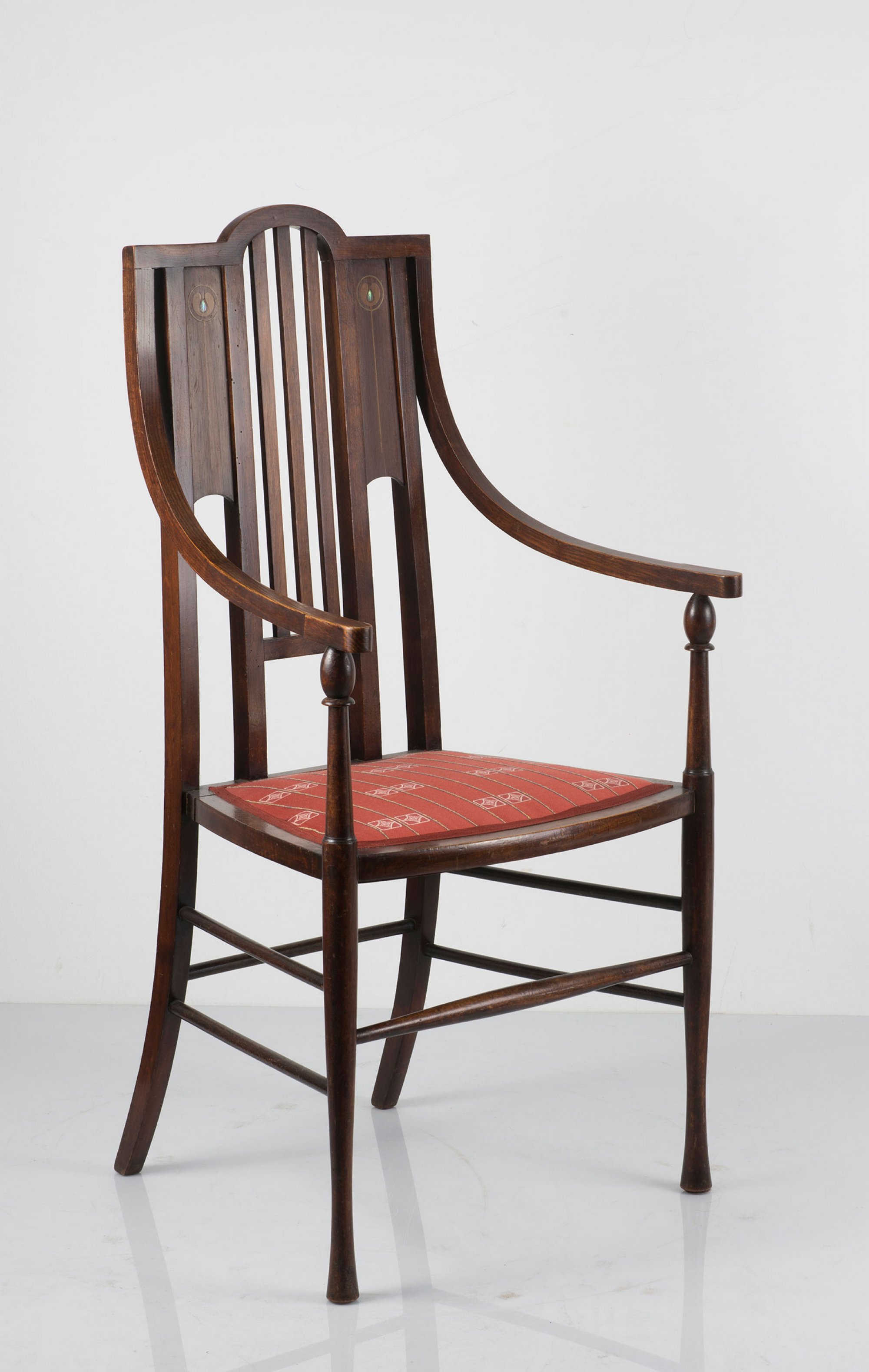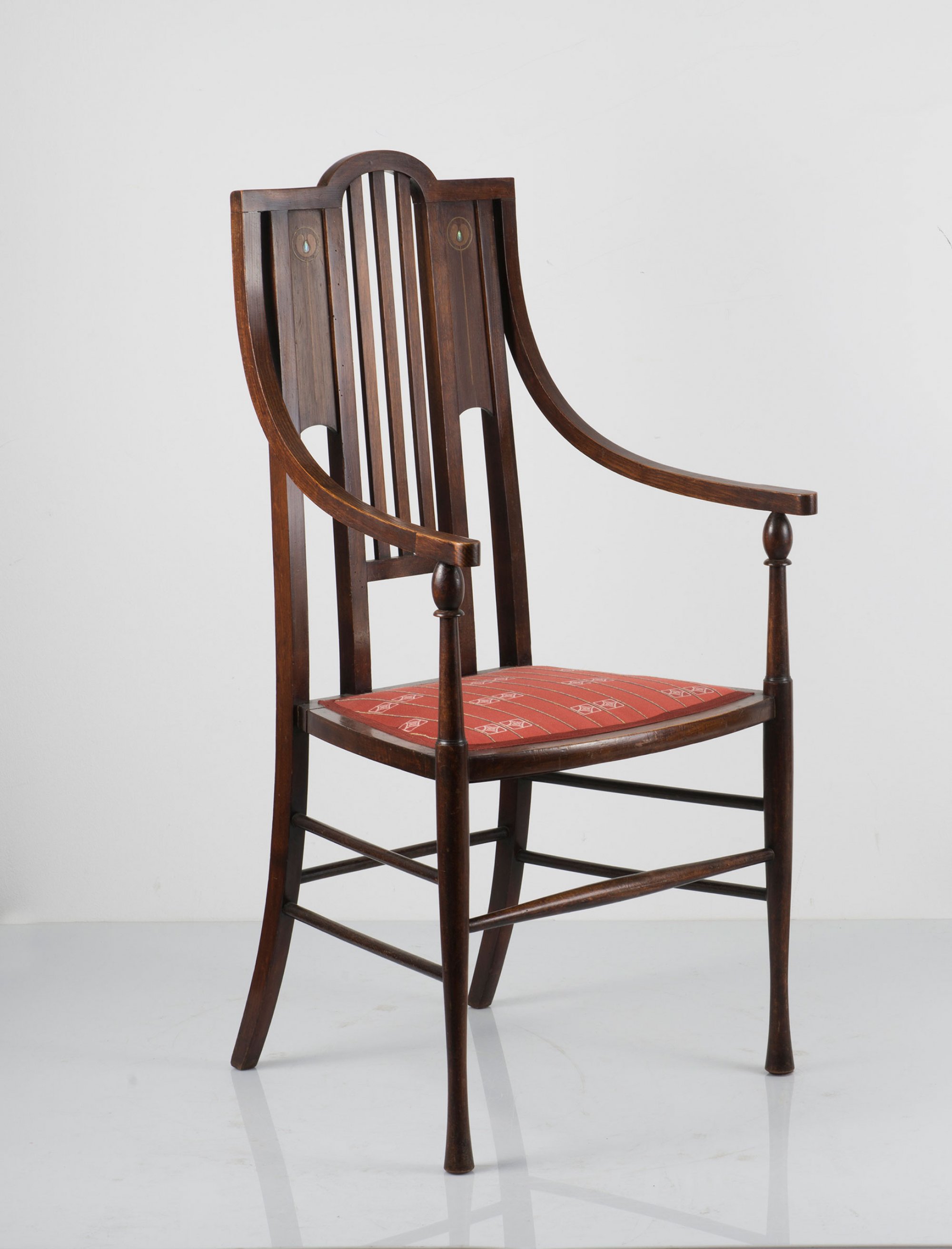 William Baker & Co., Oxford. Armchair. H. 102 cm, 50 x 46 cm. Made for Liberty & Co., London. Oak, stained dark, inlaid floral pattern of a different kind of timber with mother of pearl, red fabric. Marked: Maker's badge.