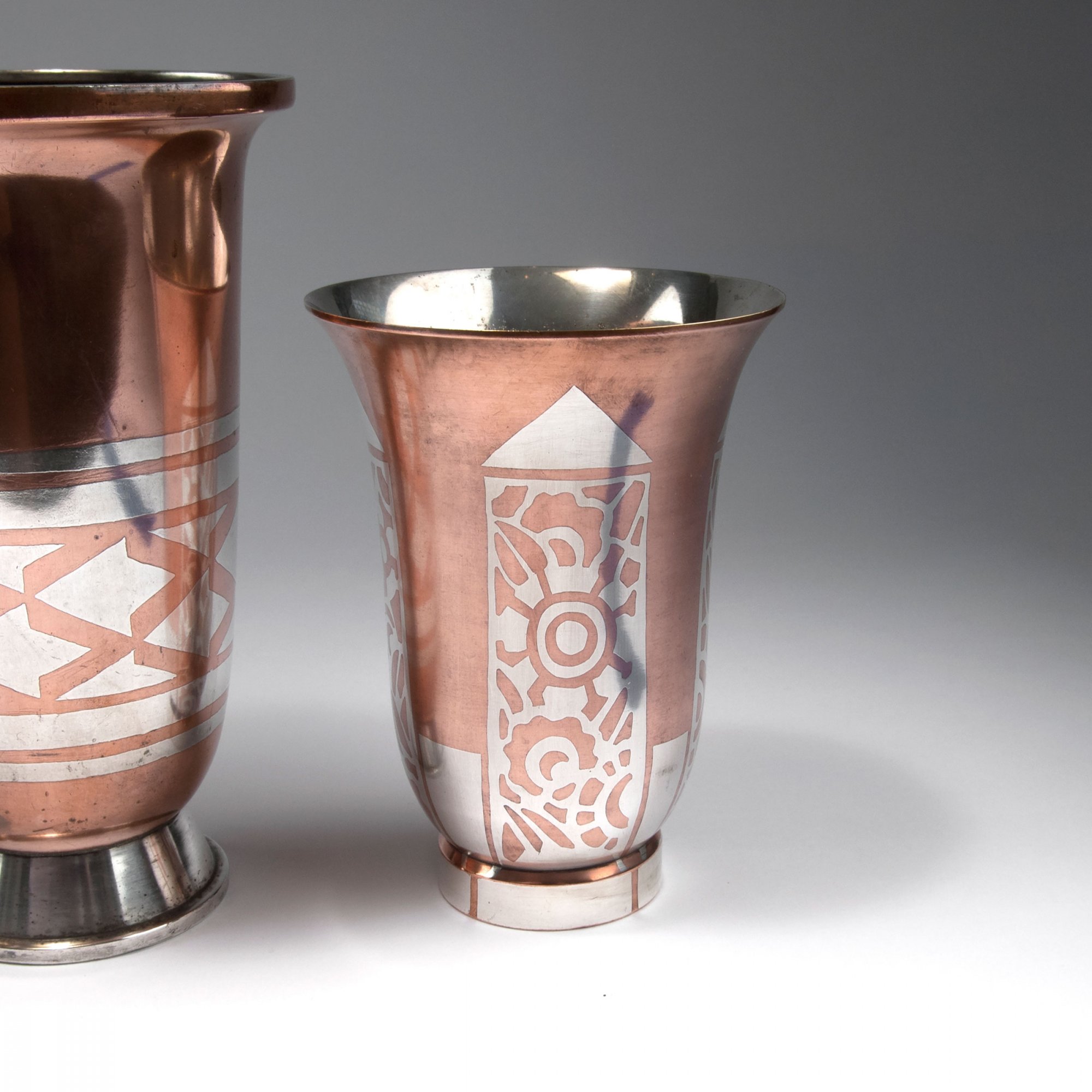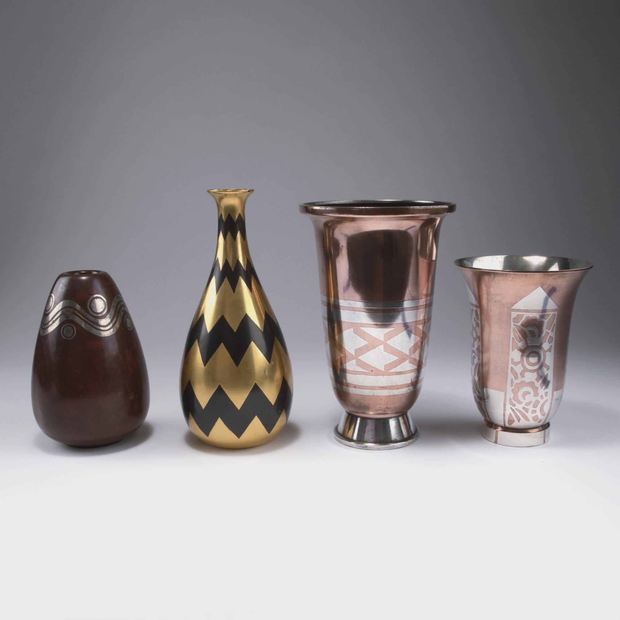 Christofle, Paris. Four 'Dinanderie' vases, c1928. H. 16.5-24.1 cm. Metal, coppered resp. silvered resp. gilded, black and rust red patina. Marked: Christofle, B, model nos. G.
