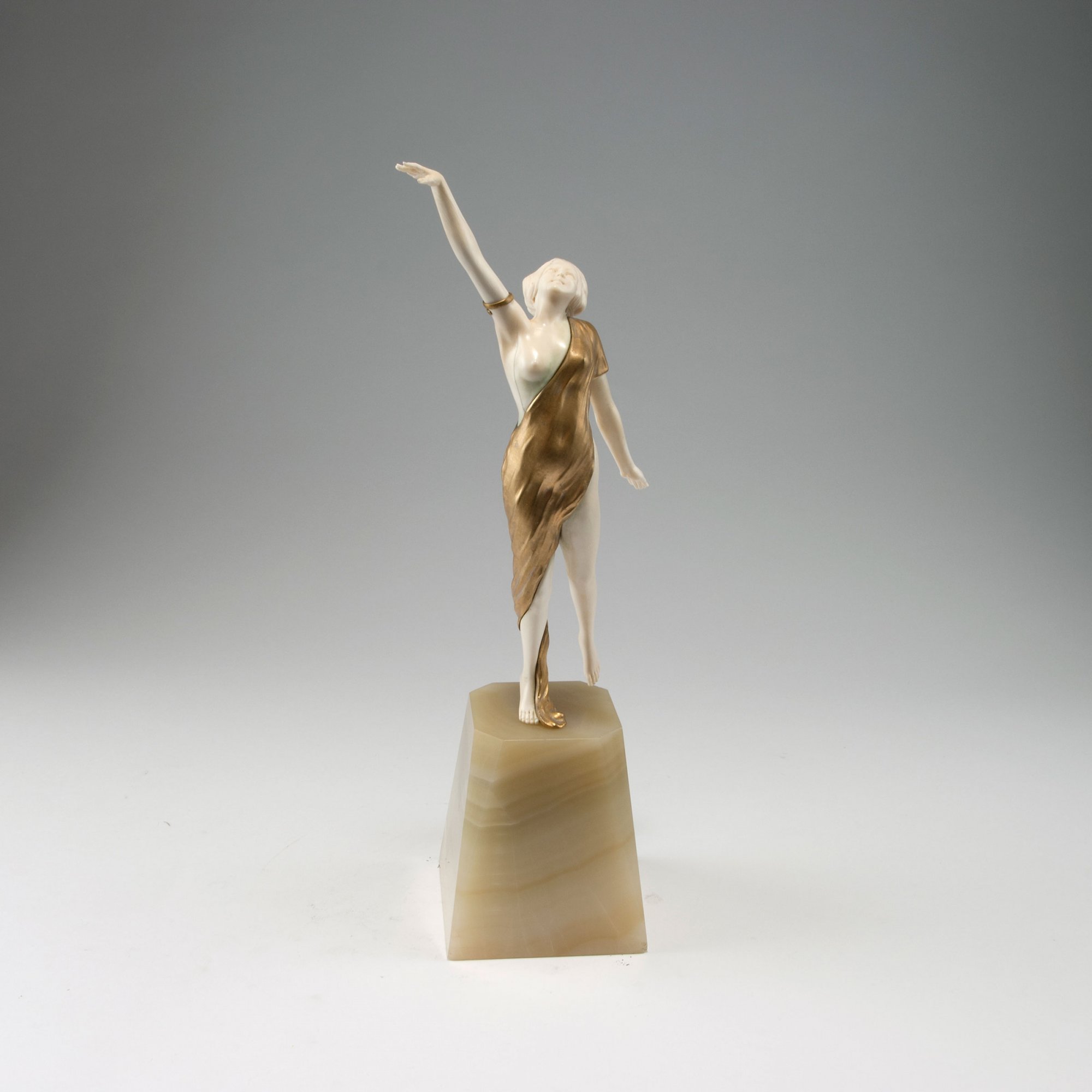 L. Barthélémy. Dancer, 1920s. H. 41.2 cm (incl. base). Almost the entire body is made of carved ivory, gilded bronze, green onyx base. Cloth marked: L. Barthélémy.