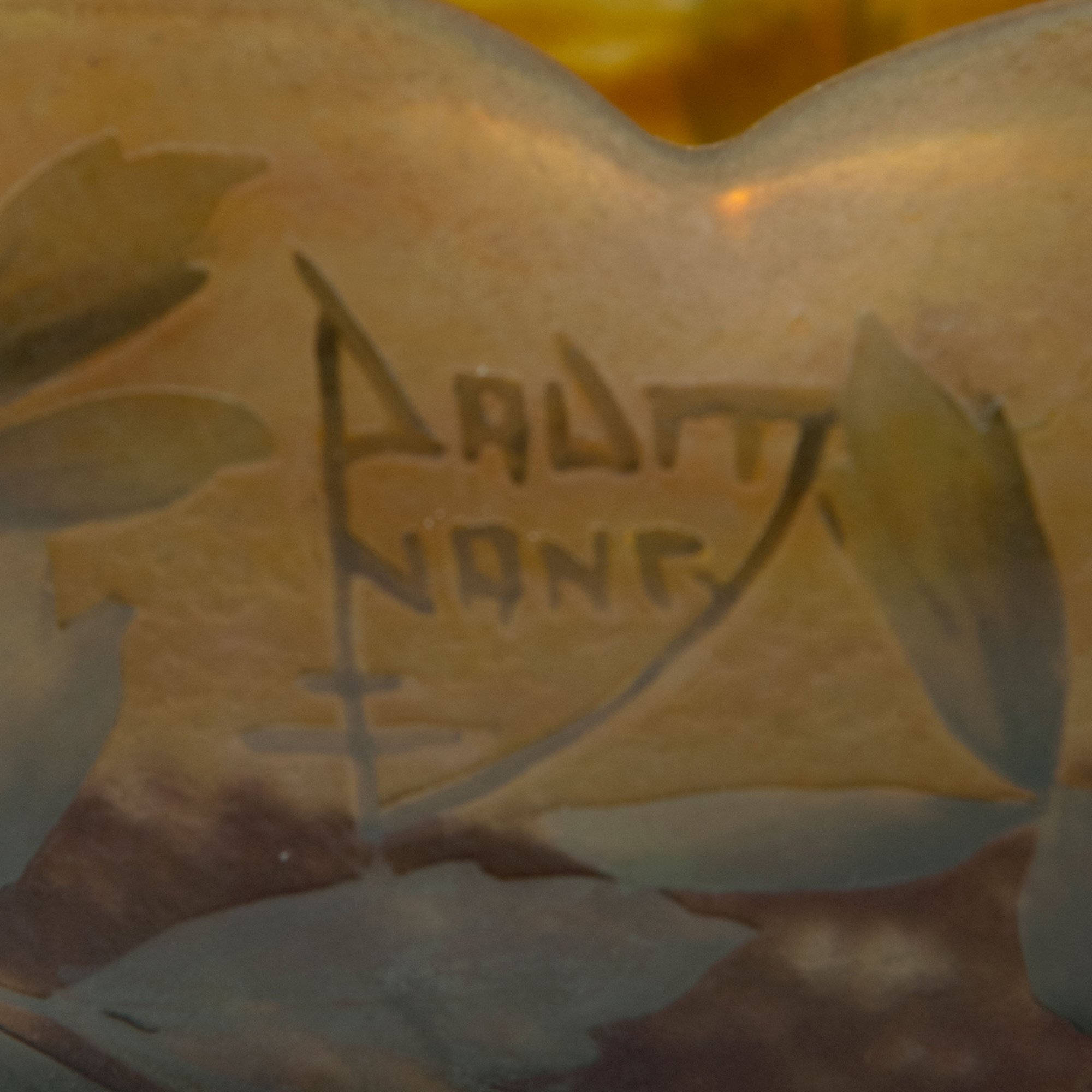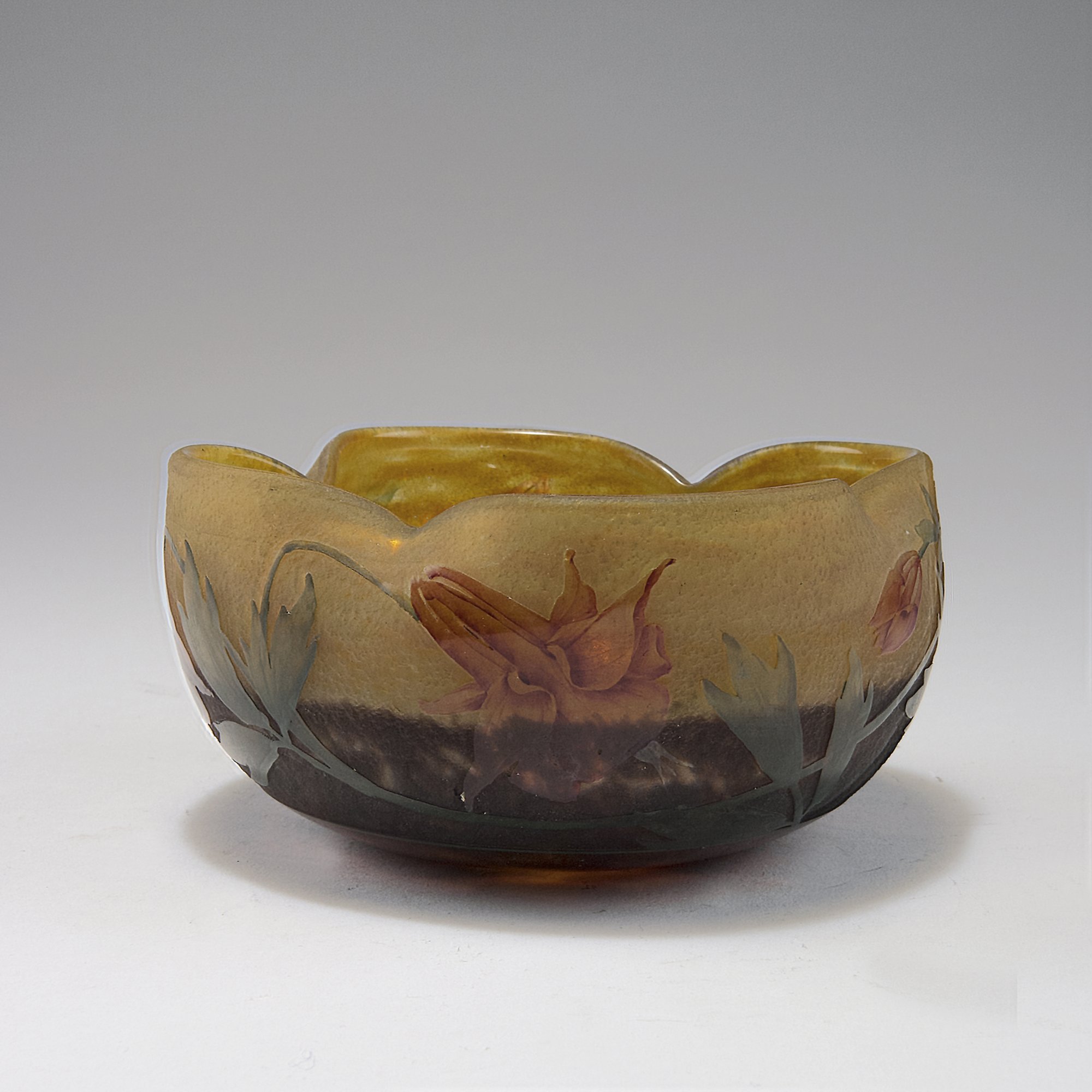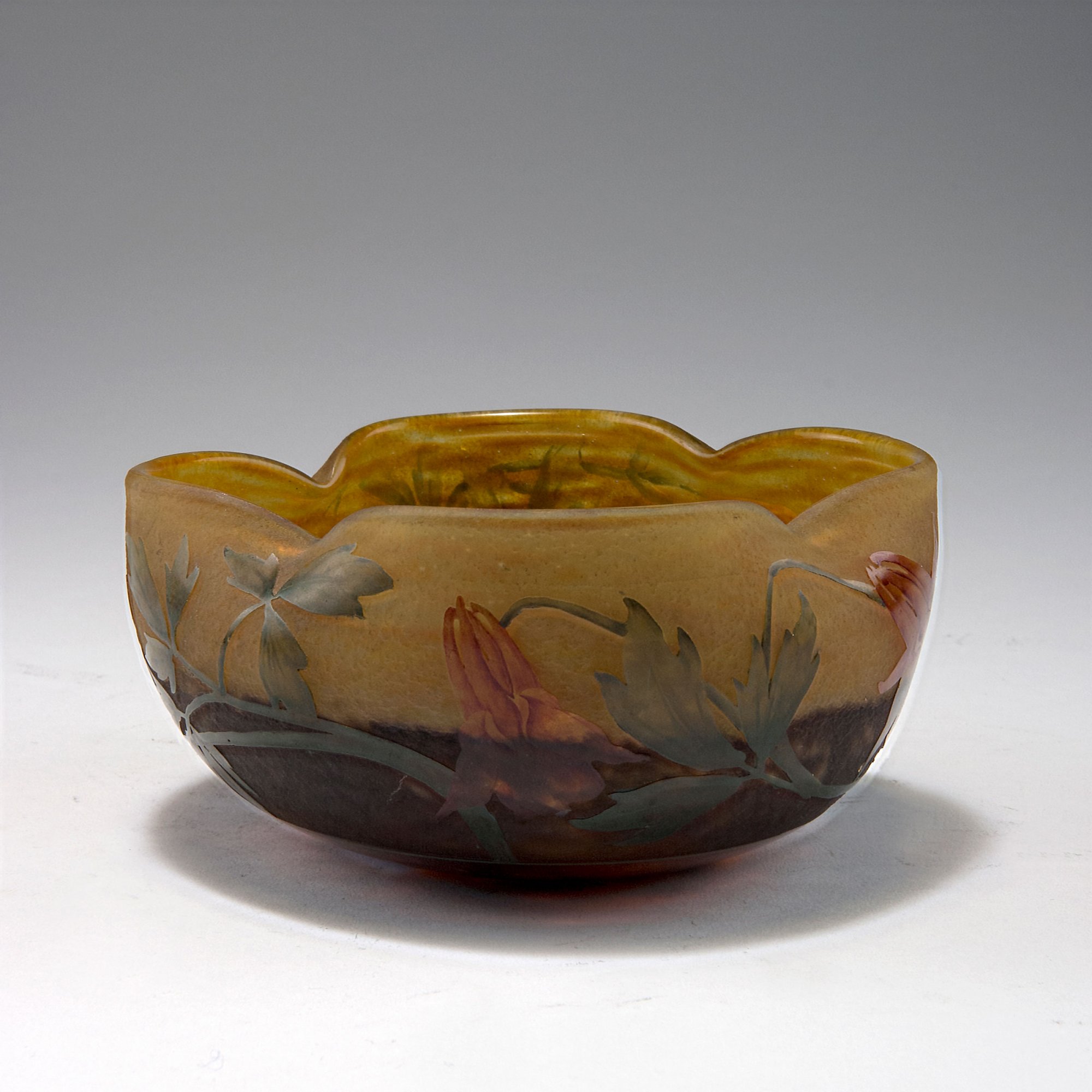 Daum Frères, Nancy. 'Ancolies' bowl, c1910. H. 7.4 cm, D. 14.5 cm. Cased glass,clear, milky pale yellow and purple powder inclusions, matted, polychromatic enamel. Aquilegia. Signed: DAUM NANCY, cross of Lorraine.