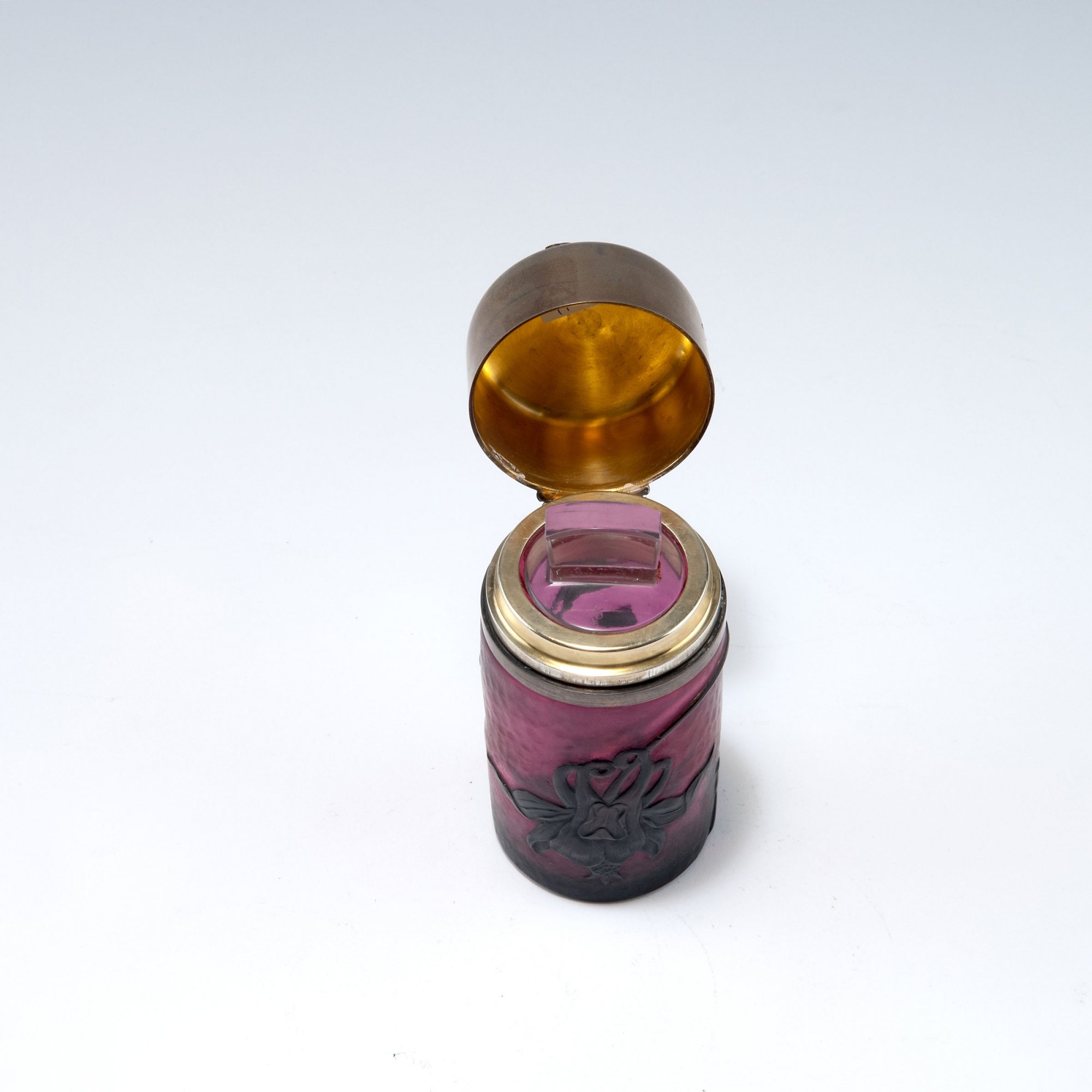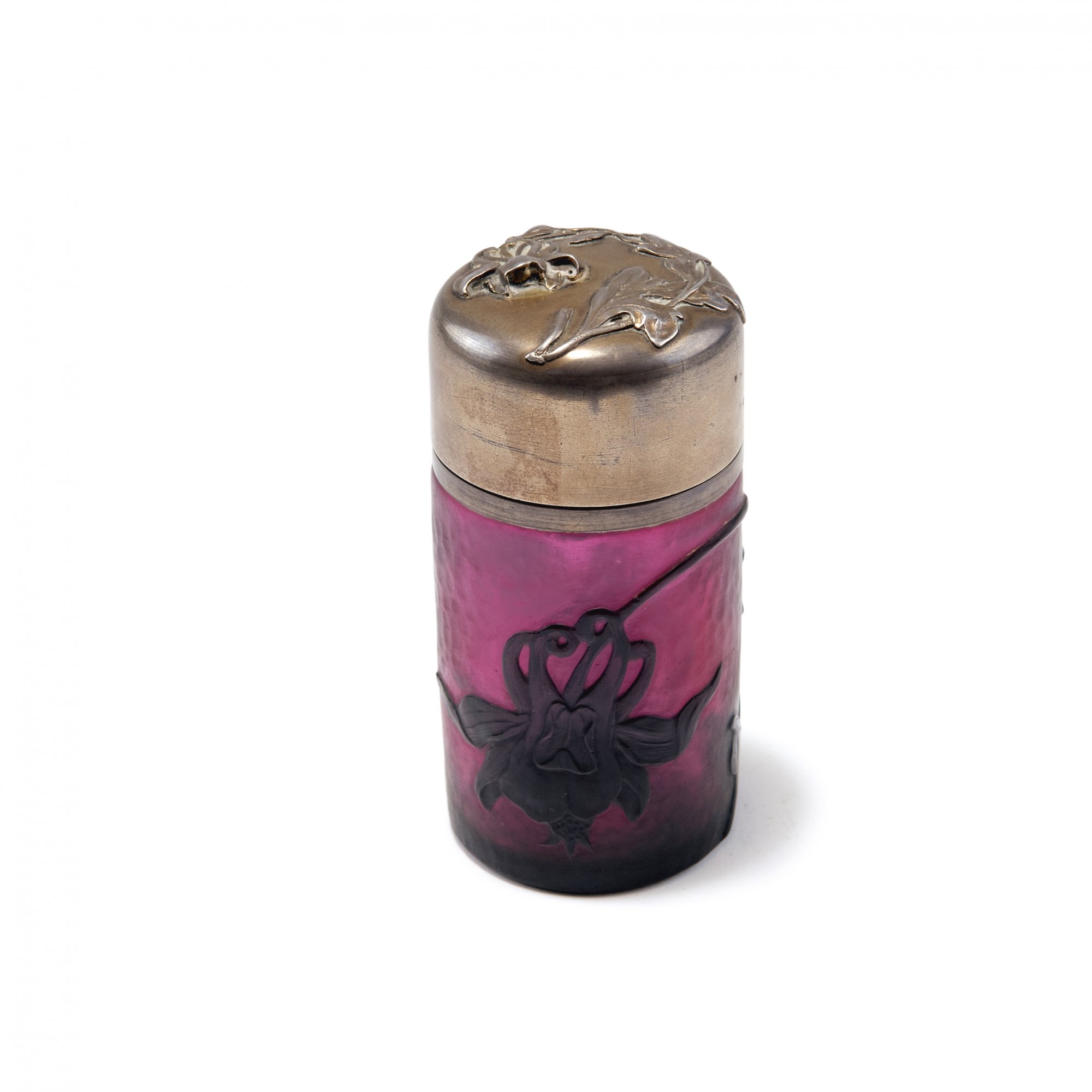 Daum Frères, Nancy. 'Ancolies' perfume flacon with Martelé cut and silver mounting, c1898. H. 12.7 cm. Cased glass, wine red and blue. Pattern worked with the wheel. Aquilegia, Martelé cut. Signed: DAUM NANCY, cross of Lorraine. Part of silver lid gilded, marked: M&V (faint), head of Minerva (2x).