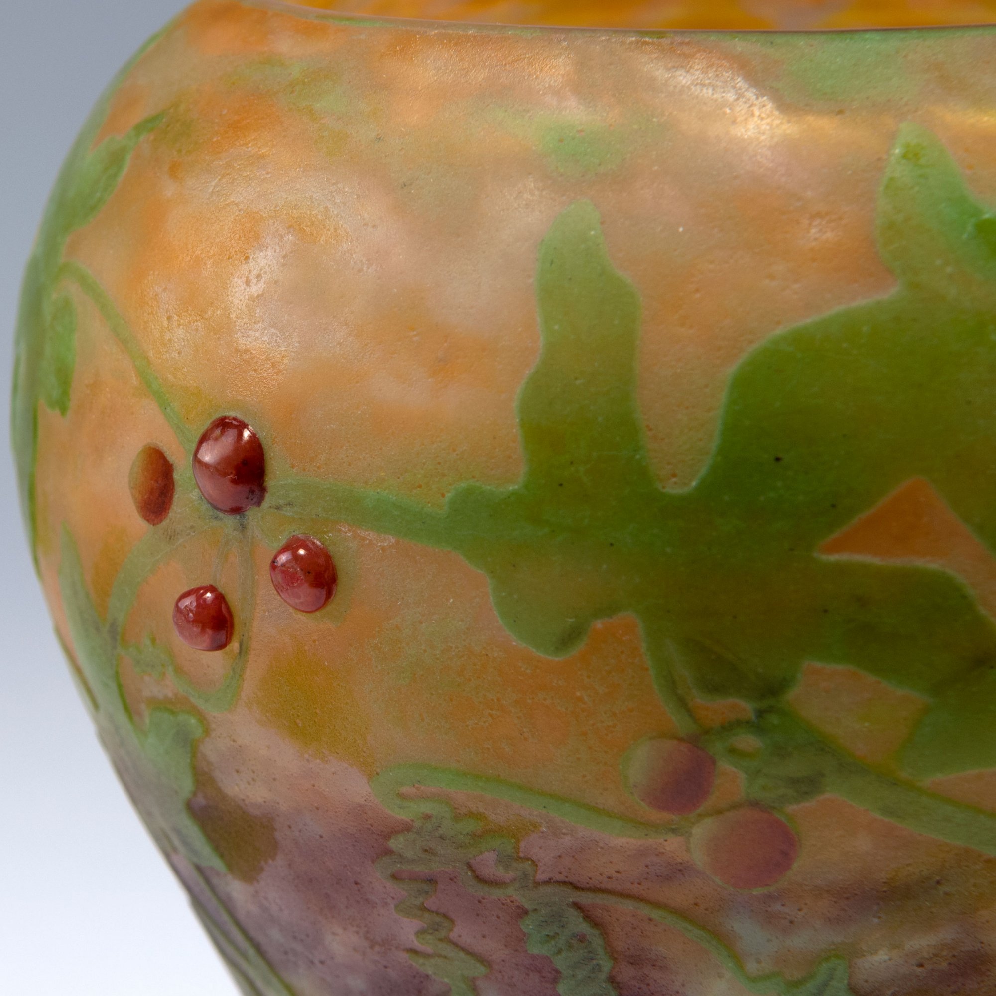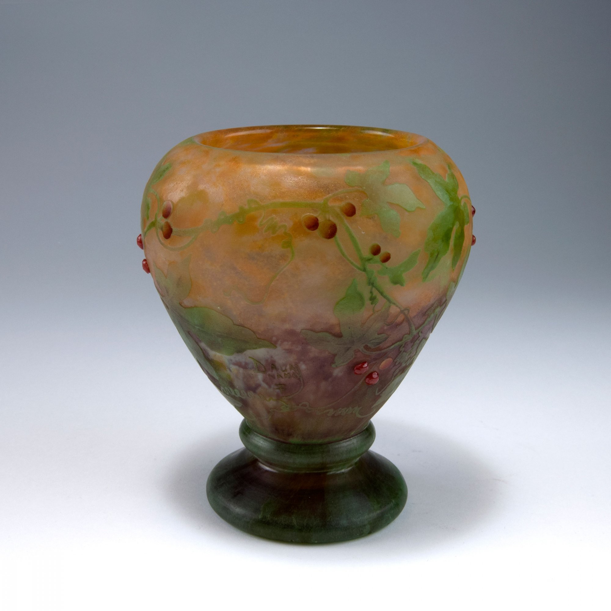 Daum Frères, Nancy. 'Bryone' vase, 1909. H. 16.8 cm. Cased glass, clear, milk white, yellow and purple powder inclusions, green enamel fusions (vitrifications). Etched and enamelled pattern with bryony. Numerous berries, eight of which as applied cabochons. Signed: DAUM NANCY, cross of Lorraine.