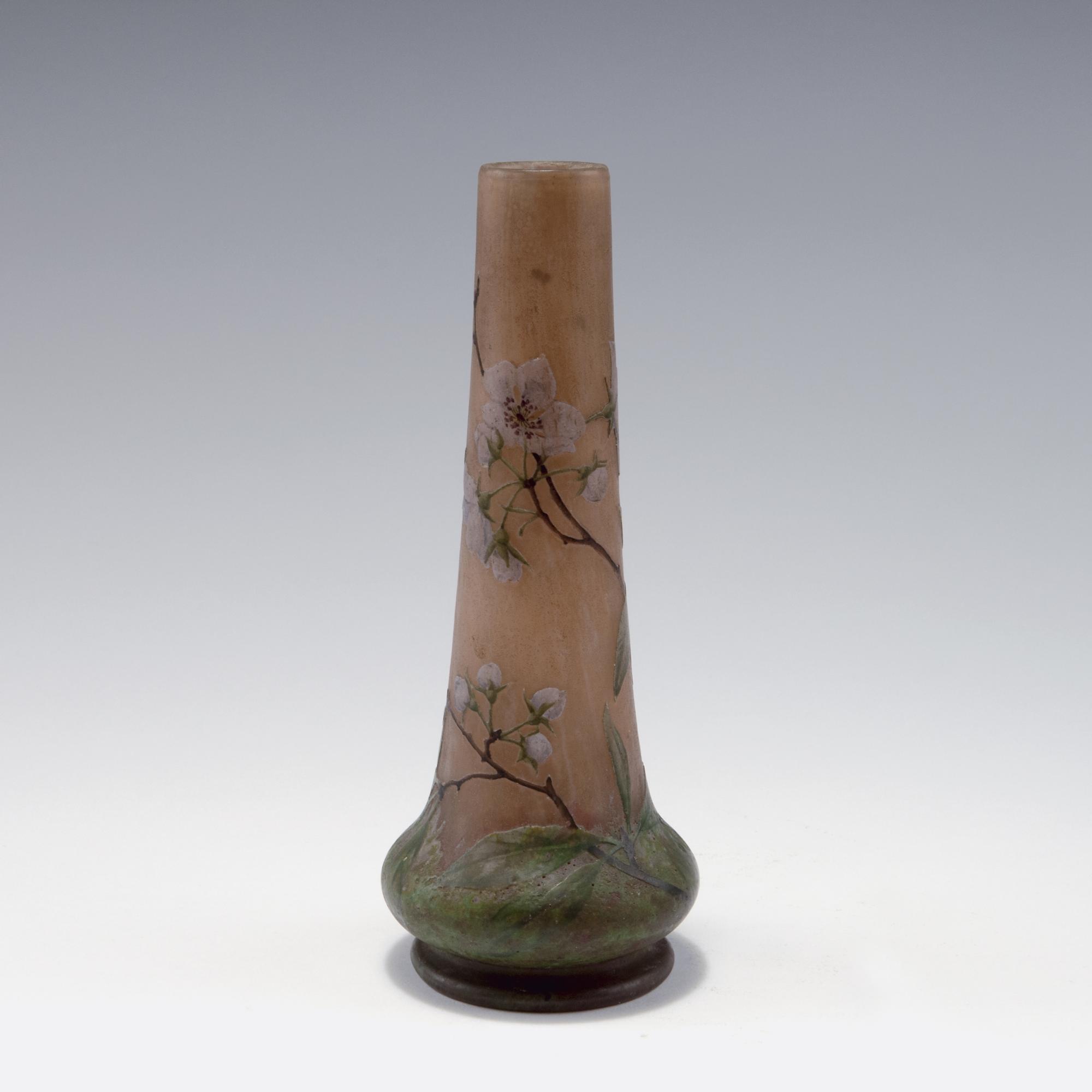 Daum Frères, Nancy. 'Cerisier en fleurs' vase, c1905. H. 20 cm. Cased glass, clear, amber and pink powder inclusions. White and green enamel fusions. Etched and enamelled pattern with cherry twigs at sunset. Signed: Daum Nancy, cross of Lorraine.