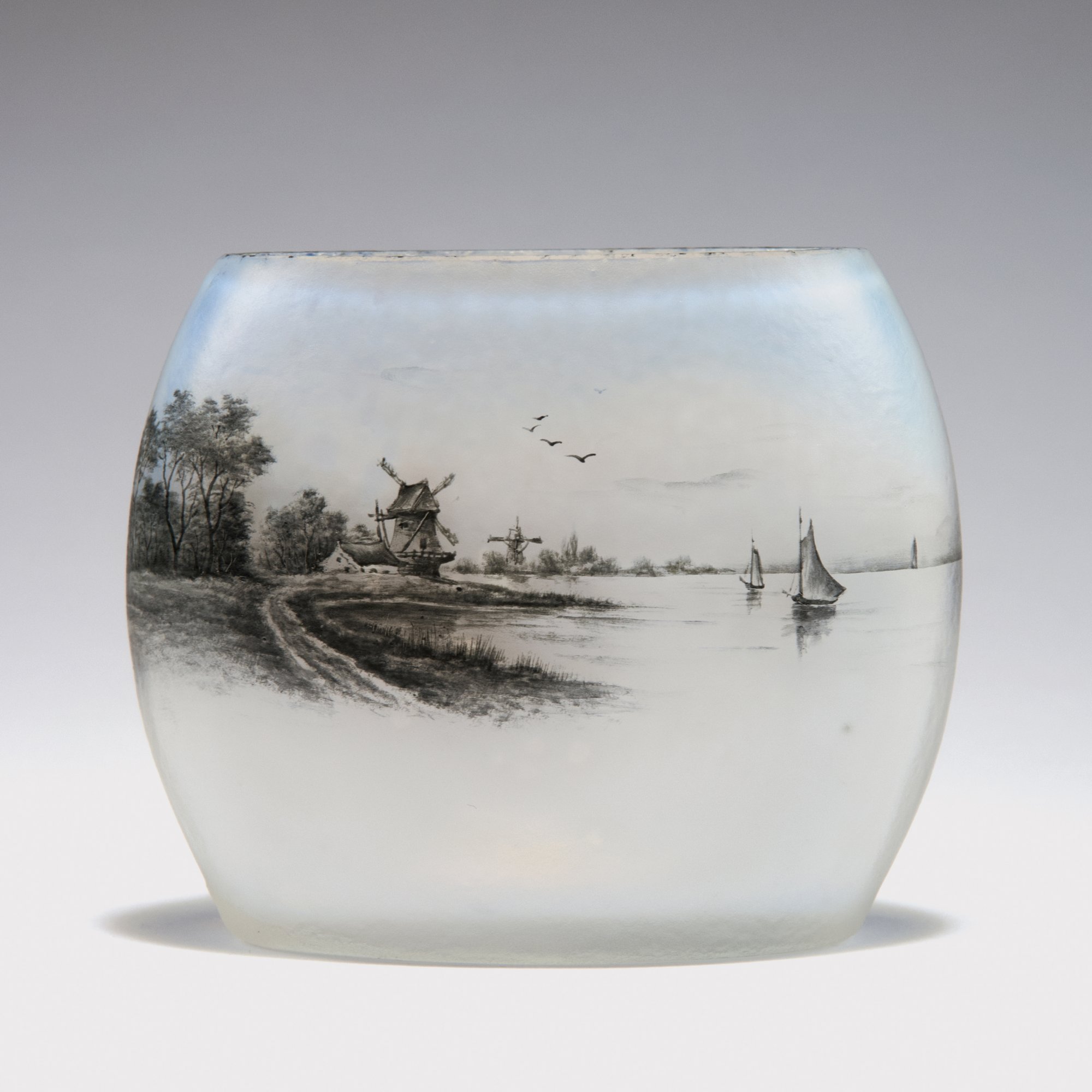 Daum Frères, Nancy. 'Delft' vase, 1899. H. 8.1 cm. Cased glass, milky opalescent and clear. Etched. Grisaille paint. Dutch coastal landscape with windmills and sailboats. Signed: Daum Nancy.