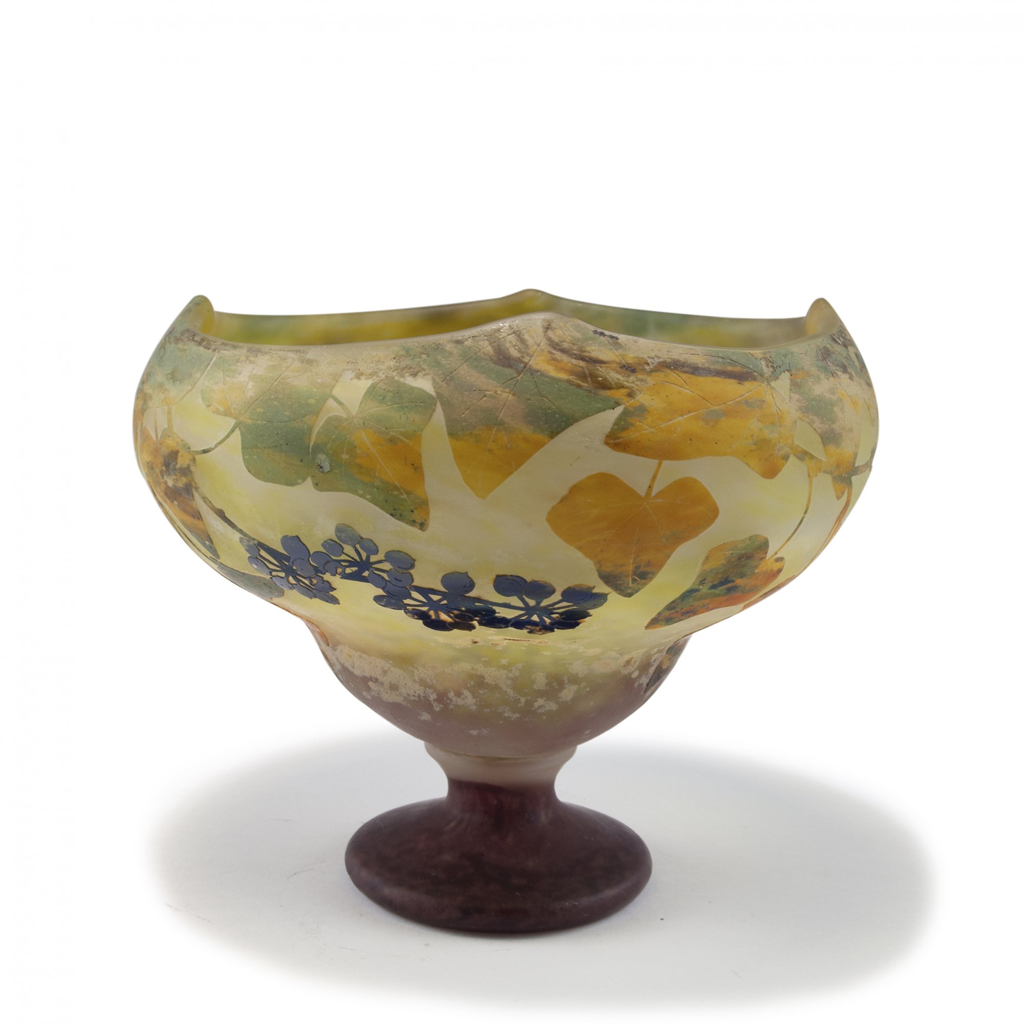 Daum Frères, Nancy. 'Je meurs ou je m'attache' goblet, c1910. H. 21.5 cm. Cased glass, clear, deep purple and yellow/green powder inclusions, green, yellow and deep blue enamel fusions (vitrifications). Multiply etched pattern with ivy. Signed: DAUM NANCY, cross of Lorraine.