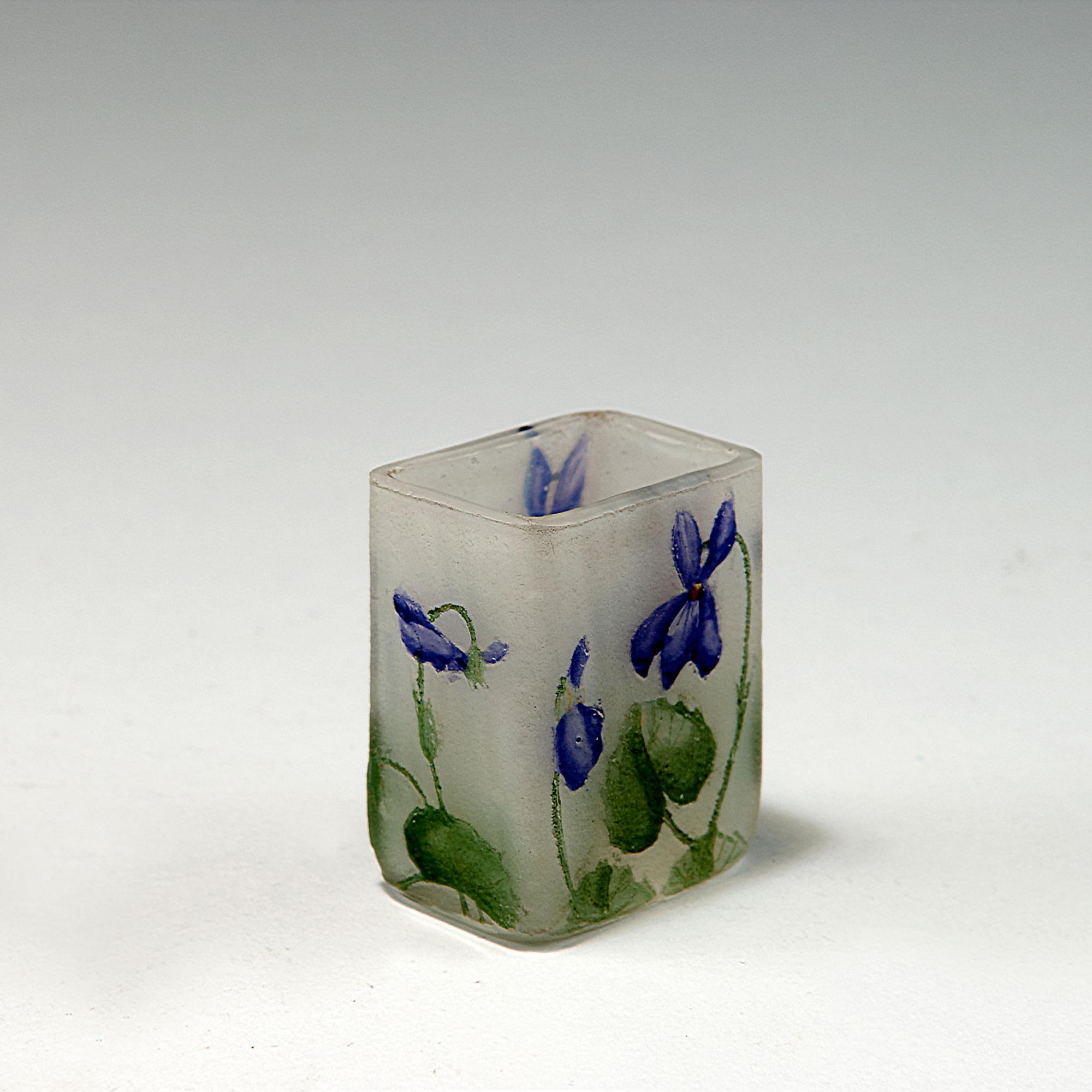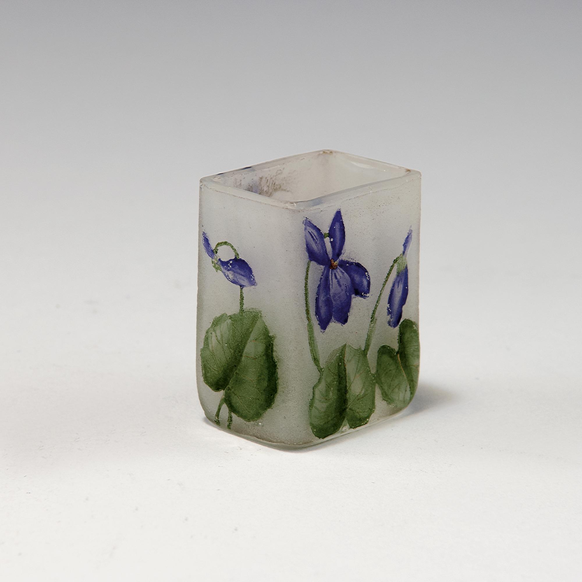 Daum Frères, Nancy. Miniature 'Violettes' vase, c1910. H. 3.8 cm. Cased glass, clear, milk white powder inclusions. Etched and enamelled pattern with violets. Signed: Daum Nancy, cross of Lorraine.