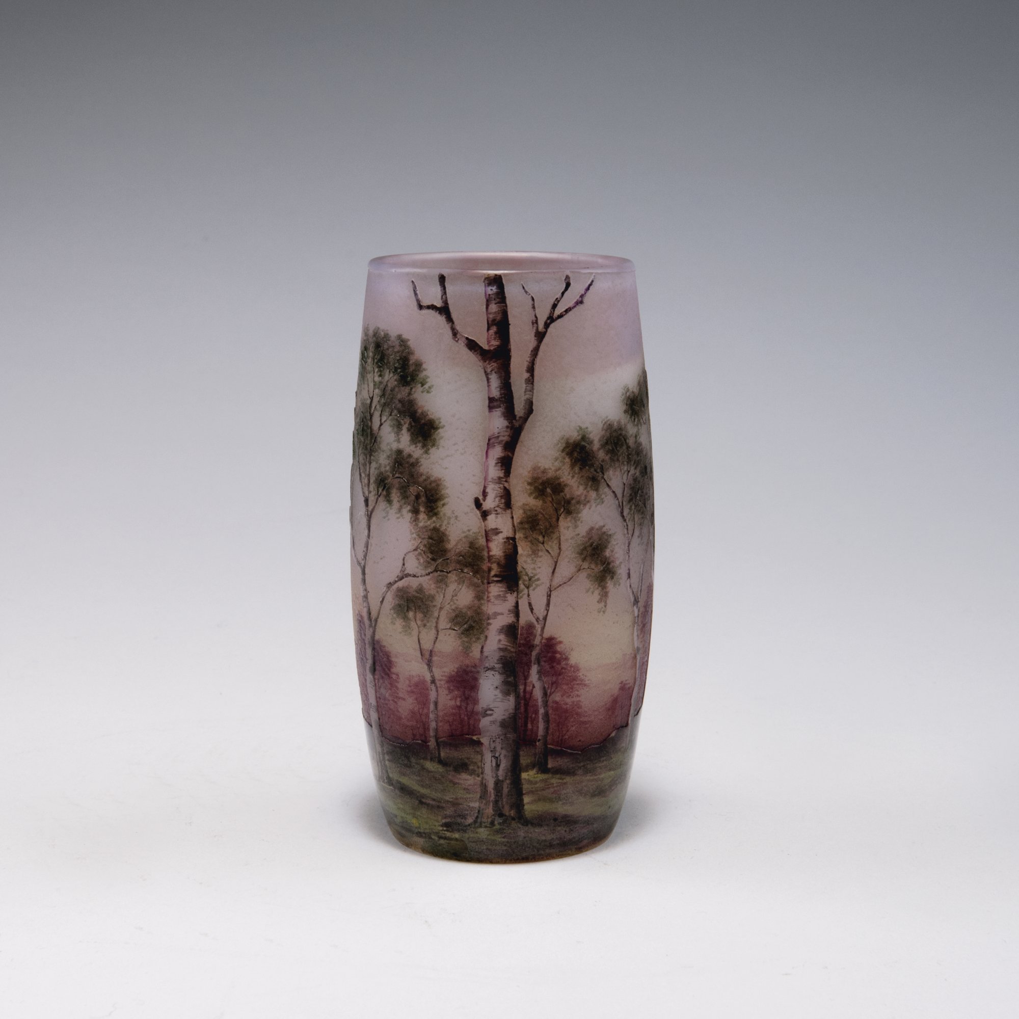 Daum Frères, Nancy. 'Paysage mauve' vase, 1907. H. 12.3 cm. Cased glass, clear, white and milky pink opalescent, rough ground, enamel and Grisaille paint. Landscape with birches at dawn. Signed: DAUM NANCY, cross of Lorraine.