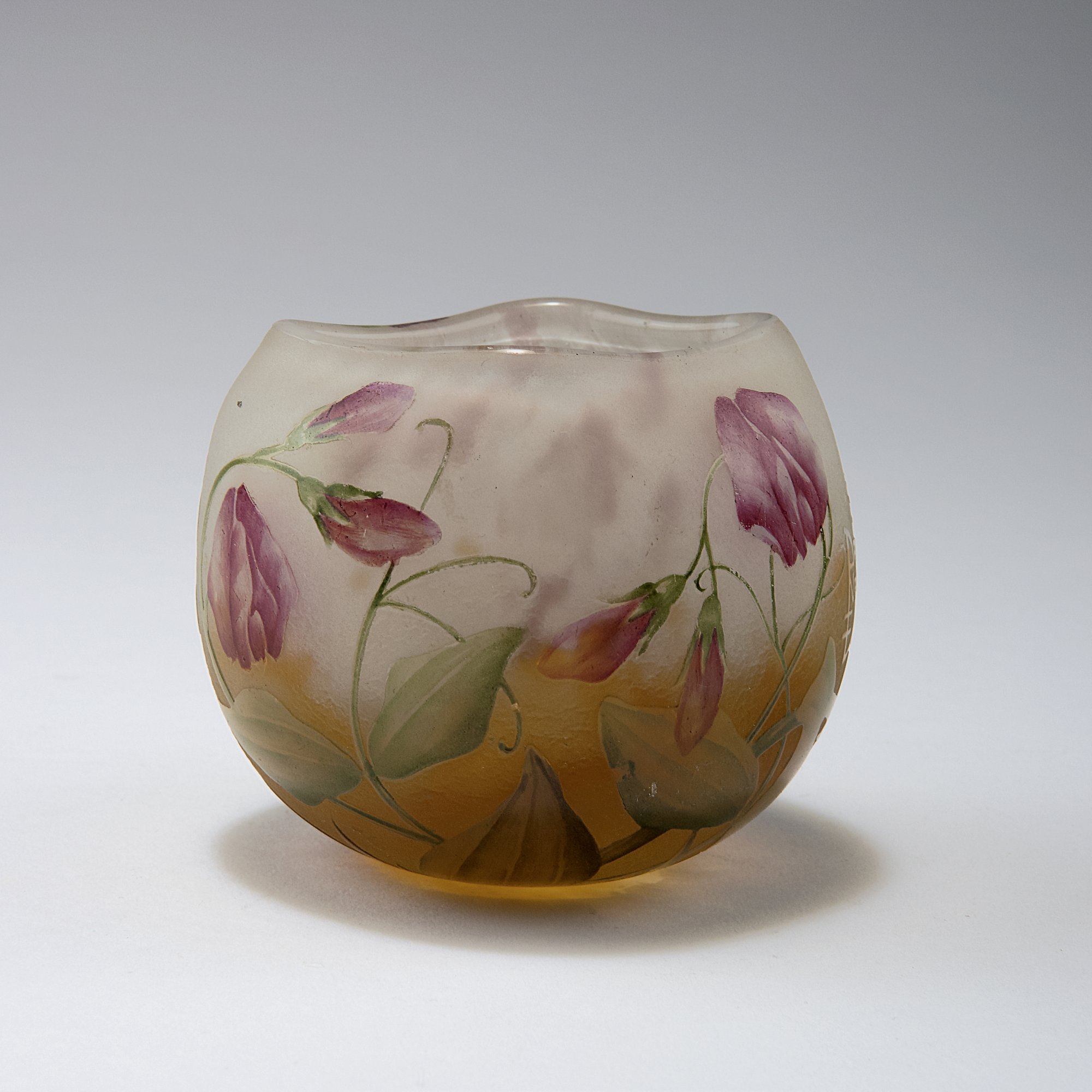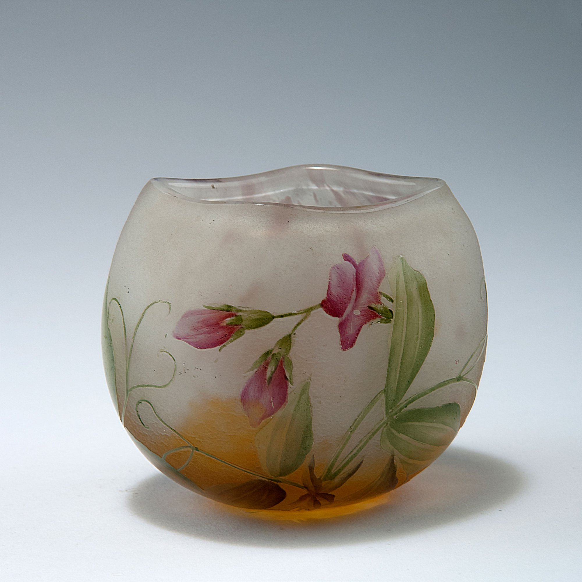 Daum Frères, Nancy. Small 'Pois de senteur' vase, 1910. H. 7 cm. Cased glass, clear, milk white, pink and amber powder inclusions. Etched and enamelled pattern, green and pink. Vetches. Signed: DAUM NANCY, cross of Lorraine, 617.