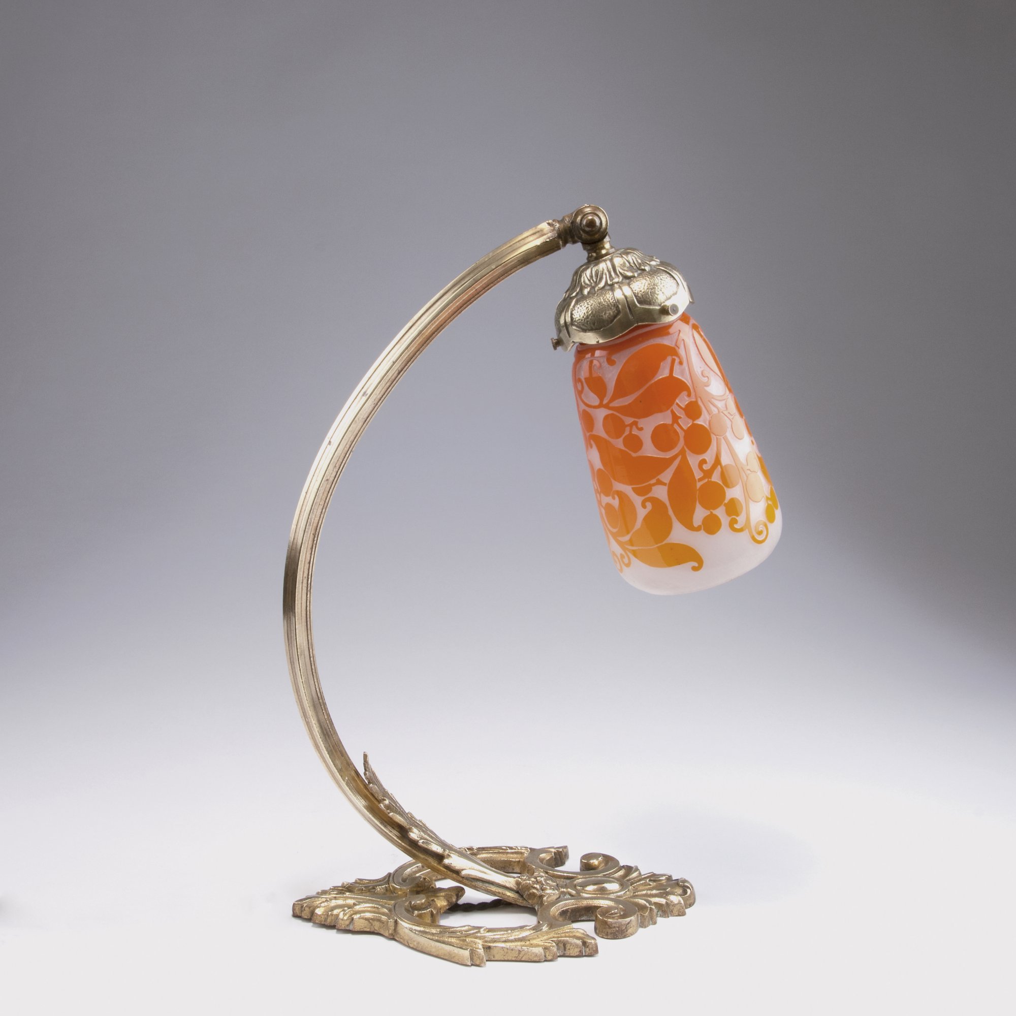 Daum Frères, Nancy. Table light, c1925. H. 36 cm. Shade of cased glass, clear, milk white powder inclusions, opaque orange etched pattern with vine. Unsigned. Brass foot.