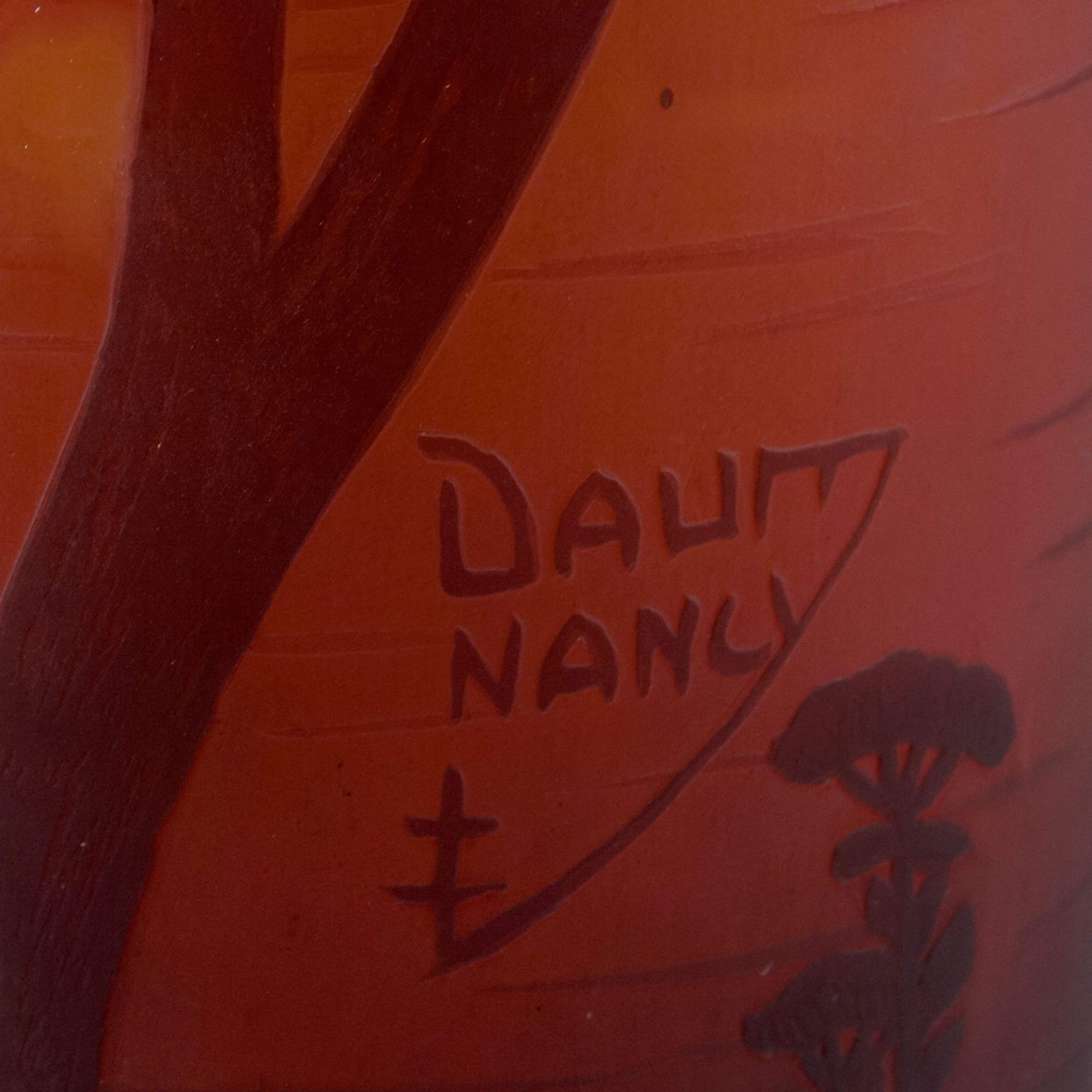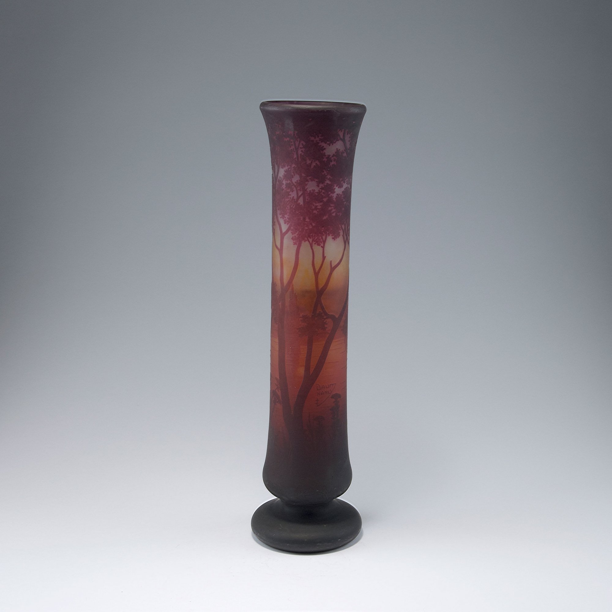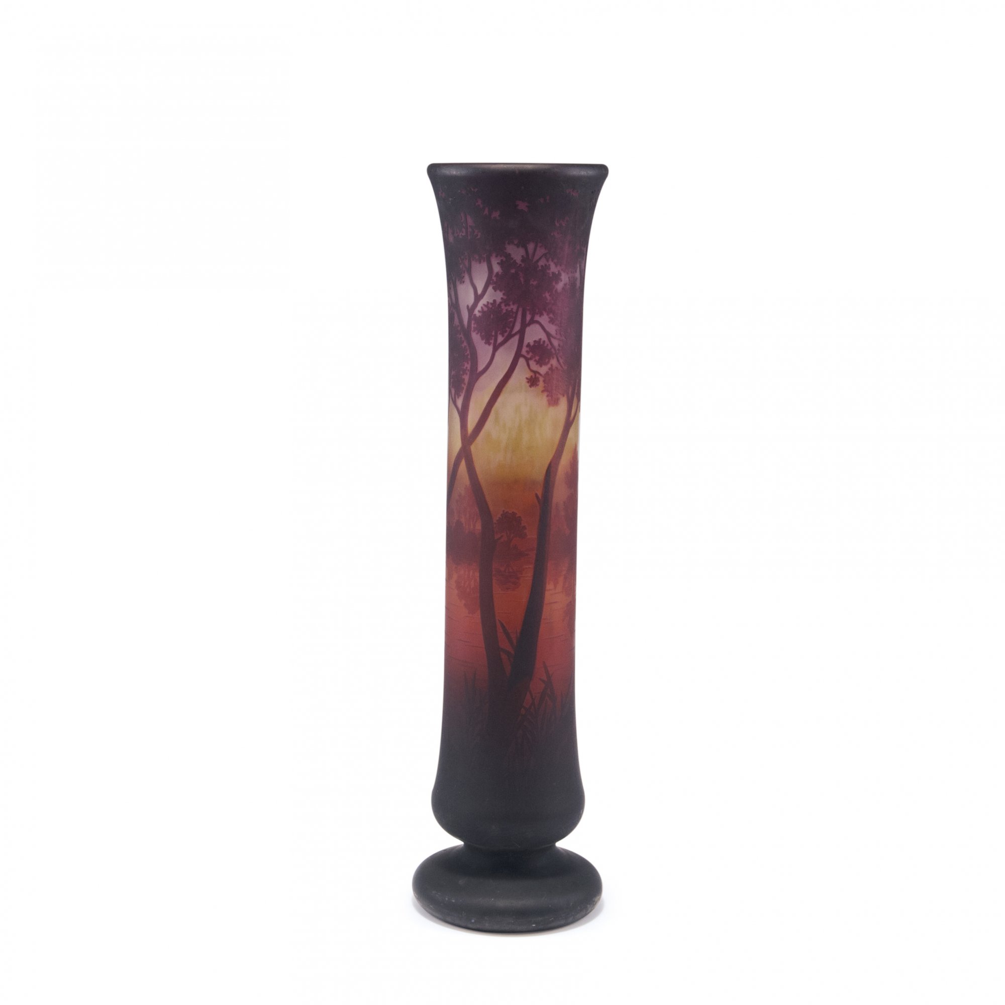 Daum Frères, Nancy. Tall 'Paysage lacustre' vase, c1910. H. 55.7 cm. Cased glass, clear, red and deep purple, yellow and orange powder inclusions. Multiply etched pattern with lake and trees at sunset. Signed: DAUM NANCY, cross of Lorraine.