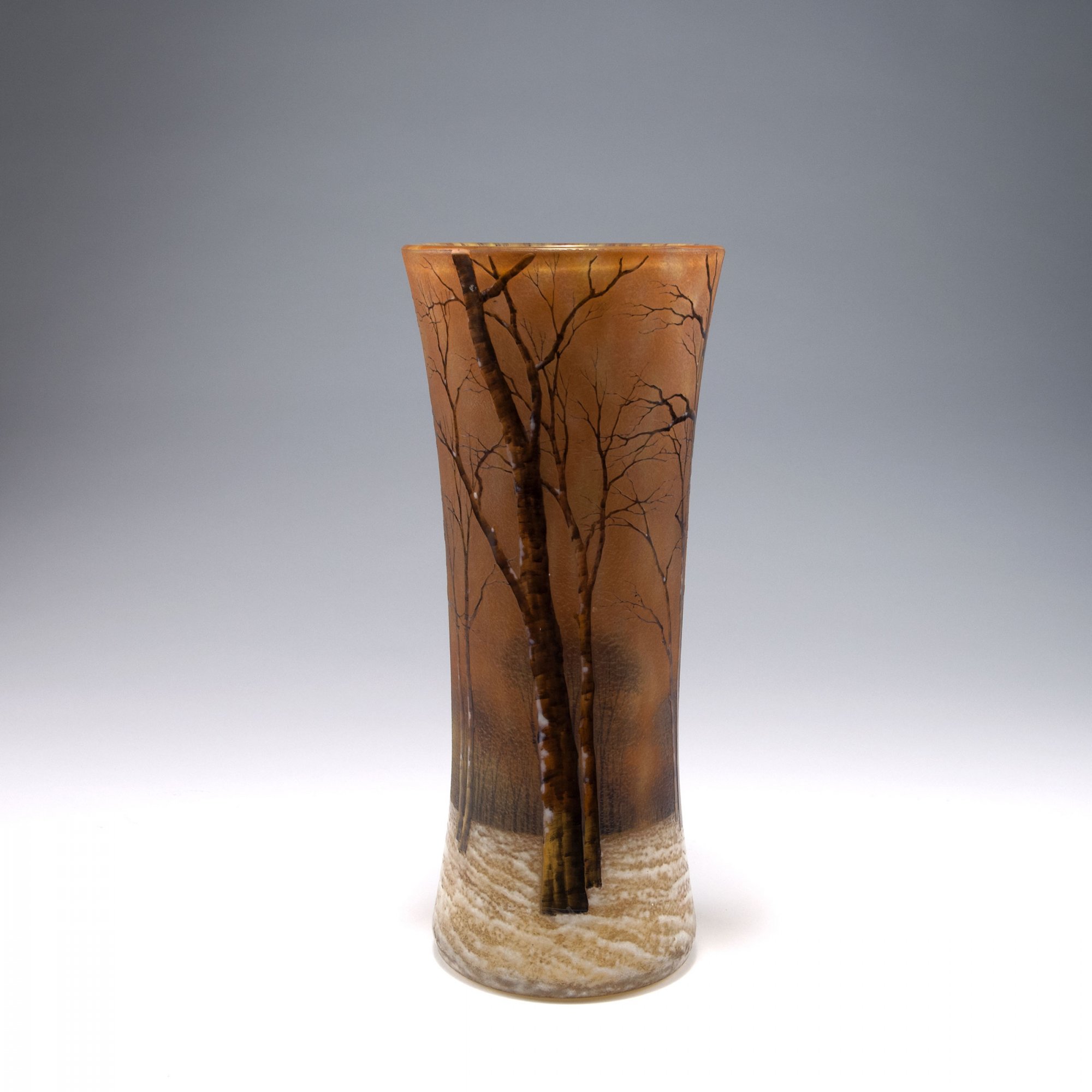 Daum Frères, Nancy. 'Crépuscule neige' or 'Paysage hiver' vase, c1906. H. 29.3 cm. Cased glass, clear, yellow, orange and red powder inclusions. Etched pattern with Grisaille paint. Winter landscape. Snowy birch trees at sunset. Signed: DAUM NANCY, cross of Lorraine, 93.
