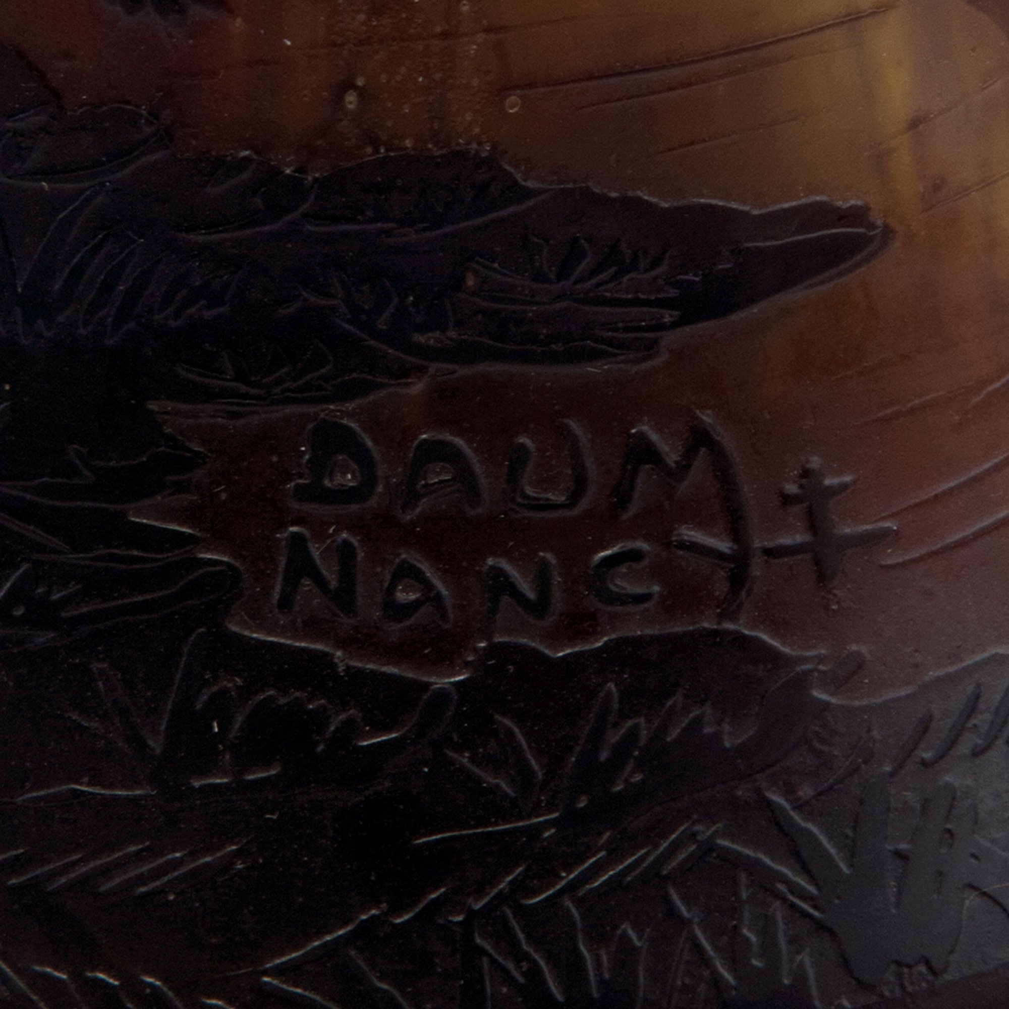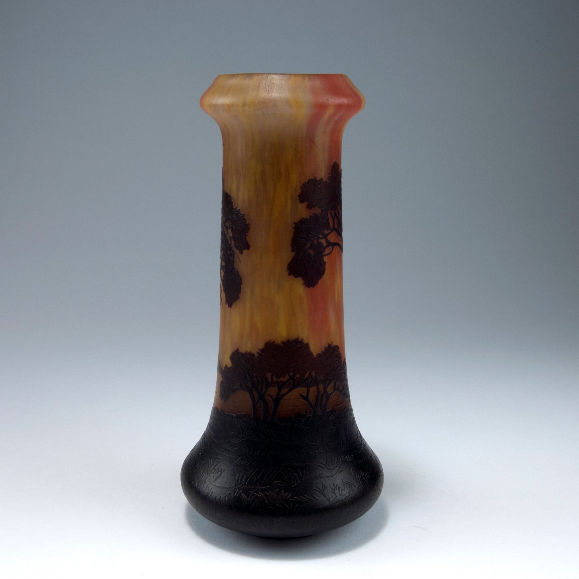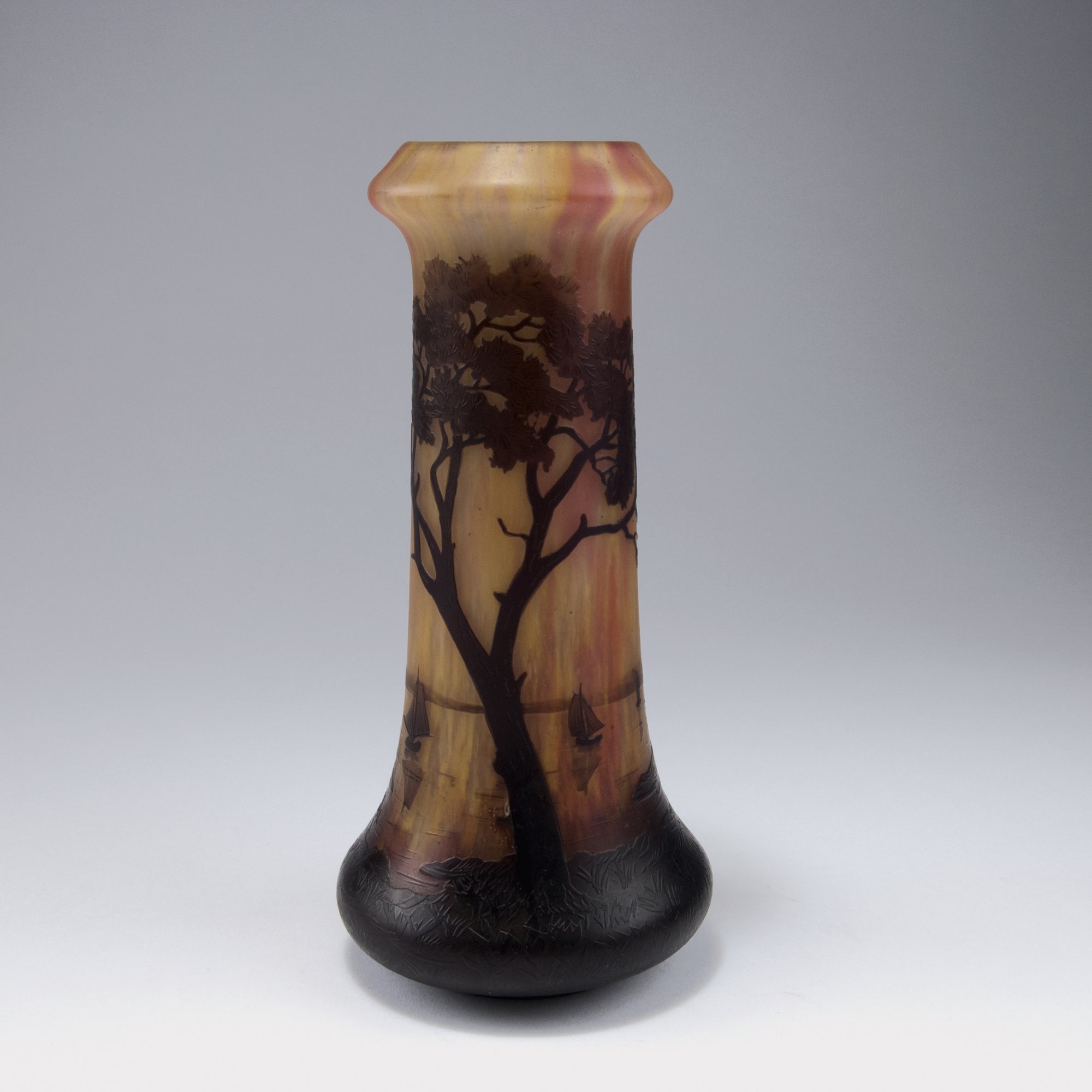 Daum Frères, Nancy. 'Voiliers, soleil couchant' vase, c1910. H. 23.8 cm. Cased glass, clear and brown, red and yellow powder inclusions. Multiply etched pattern with coastal landscape with trees and sailboats at sunset. Signed: DAUM NANCY, cross of Lorraine.