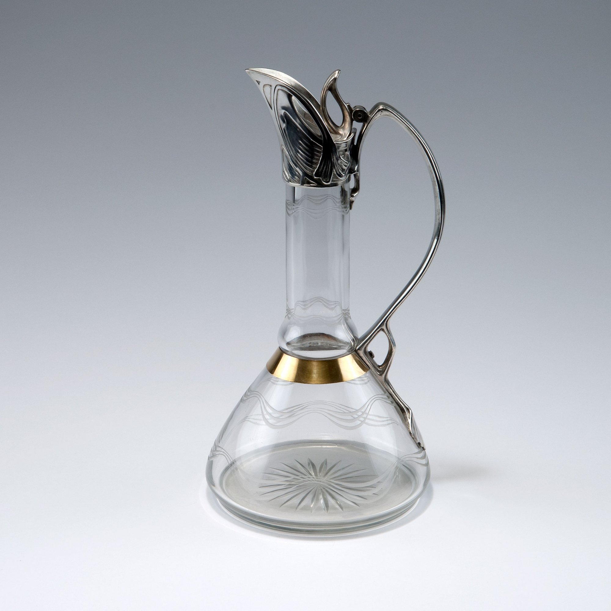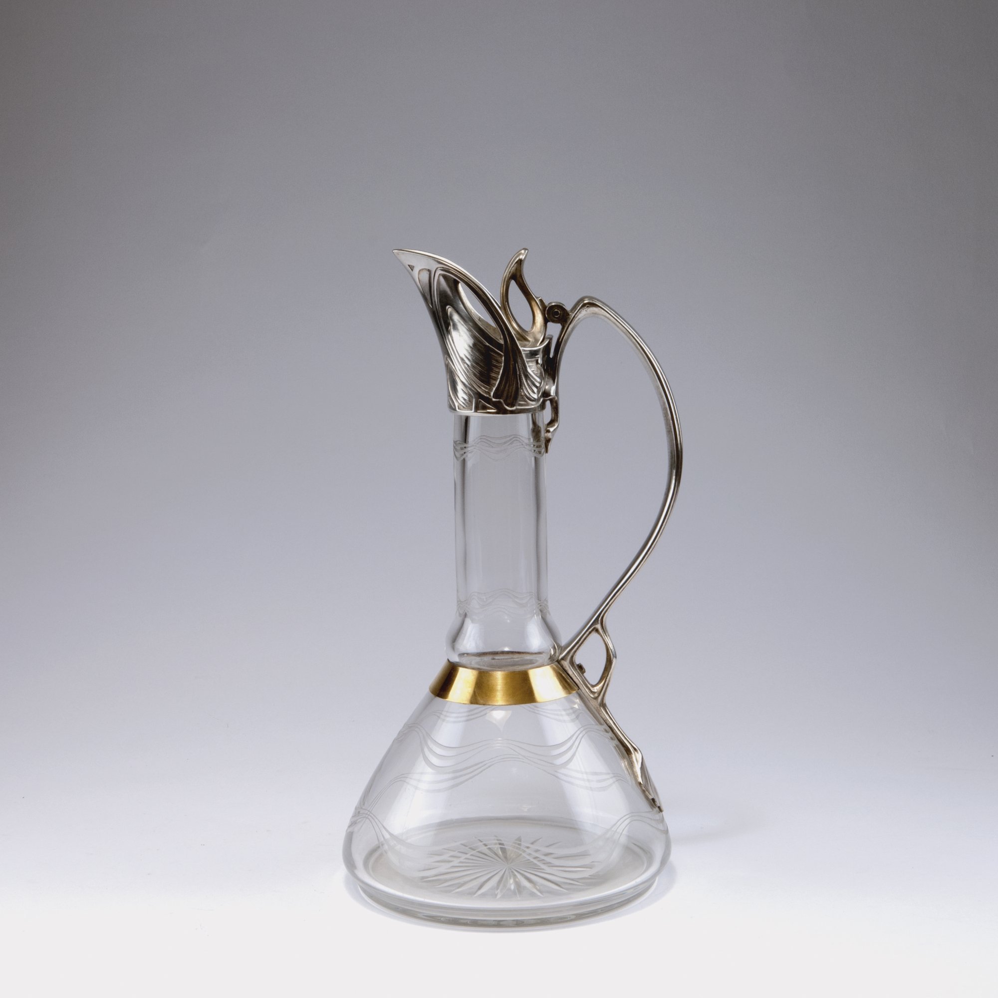 Carl Deffner, Esslingen. Carafe, c1902. H. 31.1 cm. Cut clear glass, mounting of silver-plated metal and brass. Marked: Maker's mark.