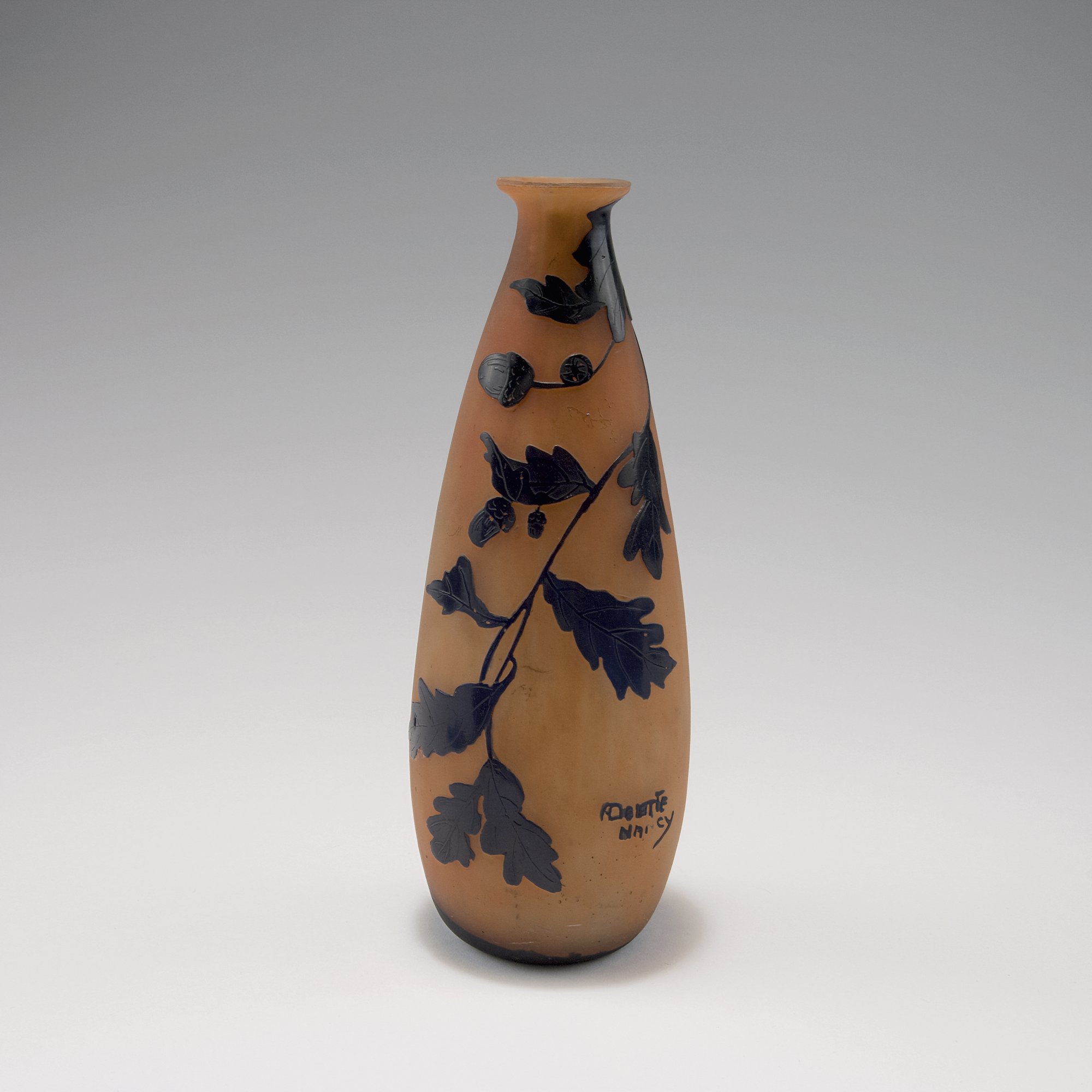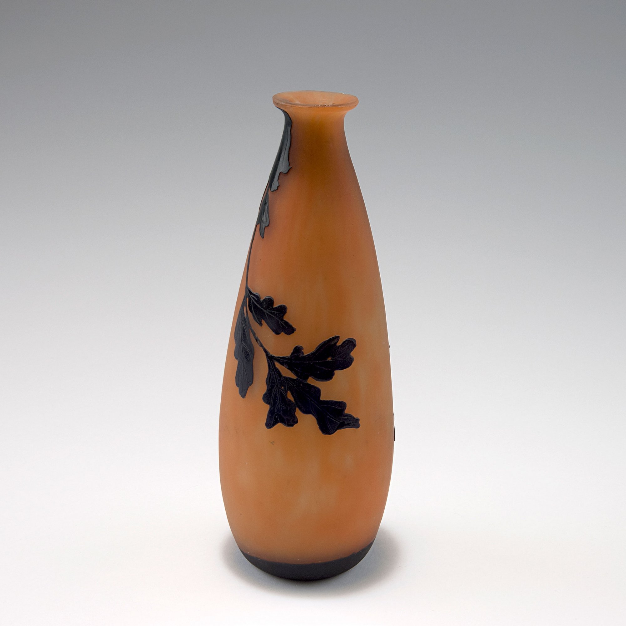 André Delatte, Nancy. 'Chêne' vase, c1925. H. 23.5 cm. Cased glass, clear, orange and purple. Multiply etched pattern, oak leaves and acorn. Signed: ADelatte Nancy.