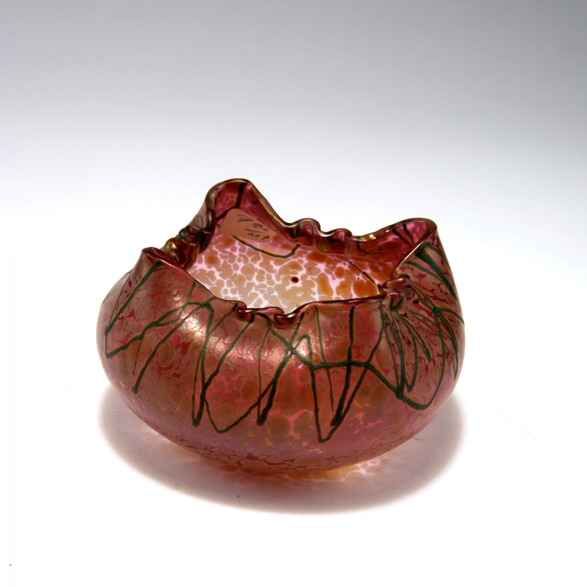 Elisabeth Glassworks, Pallme-König & Habel, Kosten. Bowl, 1900-05. H. 7.5 cm. Pink glass, silver-yellow chrushed glass, green iridescent threads.