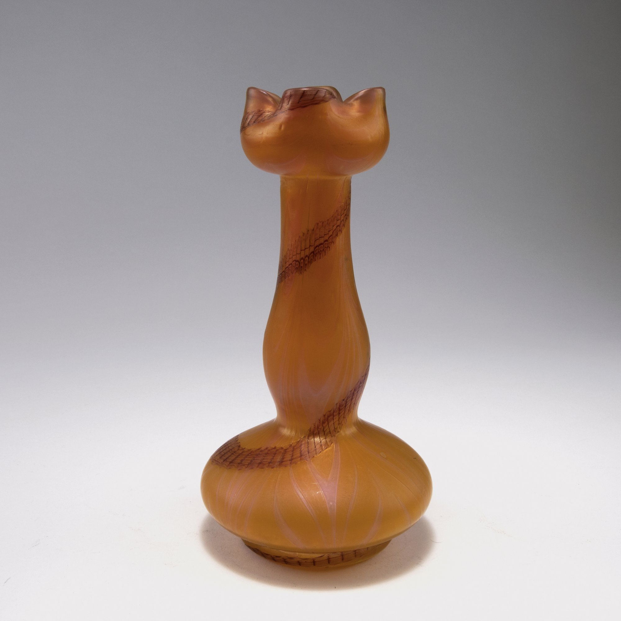 Elisabeth Glassworks, Pallme-König & Habel, Kosten. Vase, 1900-10. H. 25,5 cm. Cased glass, clear and opal pink, combed silver-yellow threads and auburn ribbons with spirals, matt iridescent.