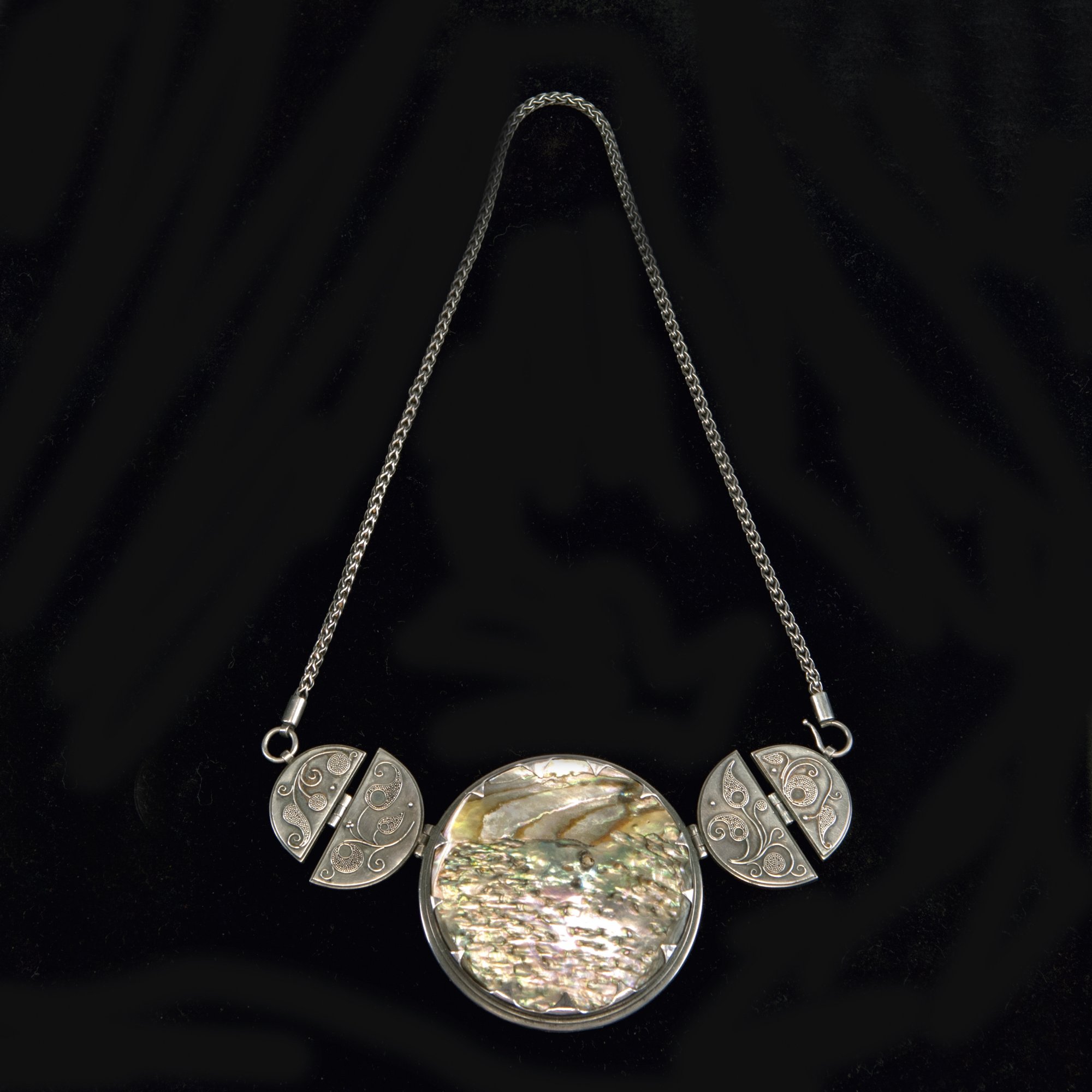 Elisabeth Treskow. Necklace, 1930s. L. 43.5 cm. Silver, cased glass, amber and clear, mother of pearl and golden matt lustre. Marked: Maker's mark, ET, 900, German hallmarks.