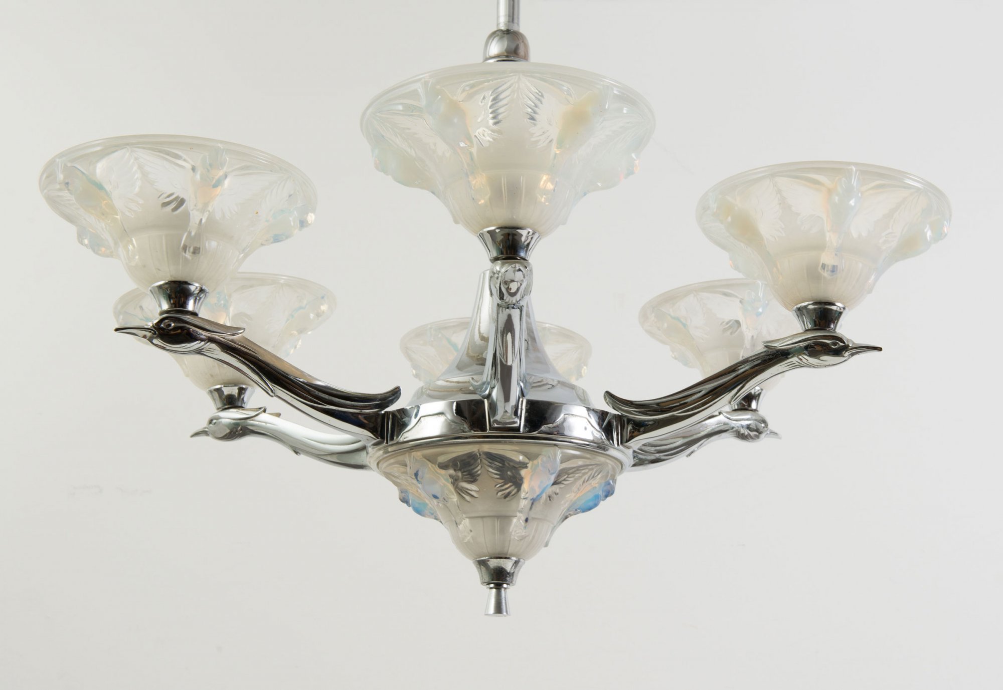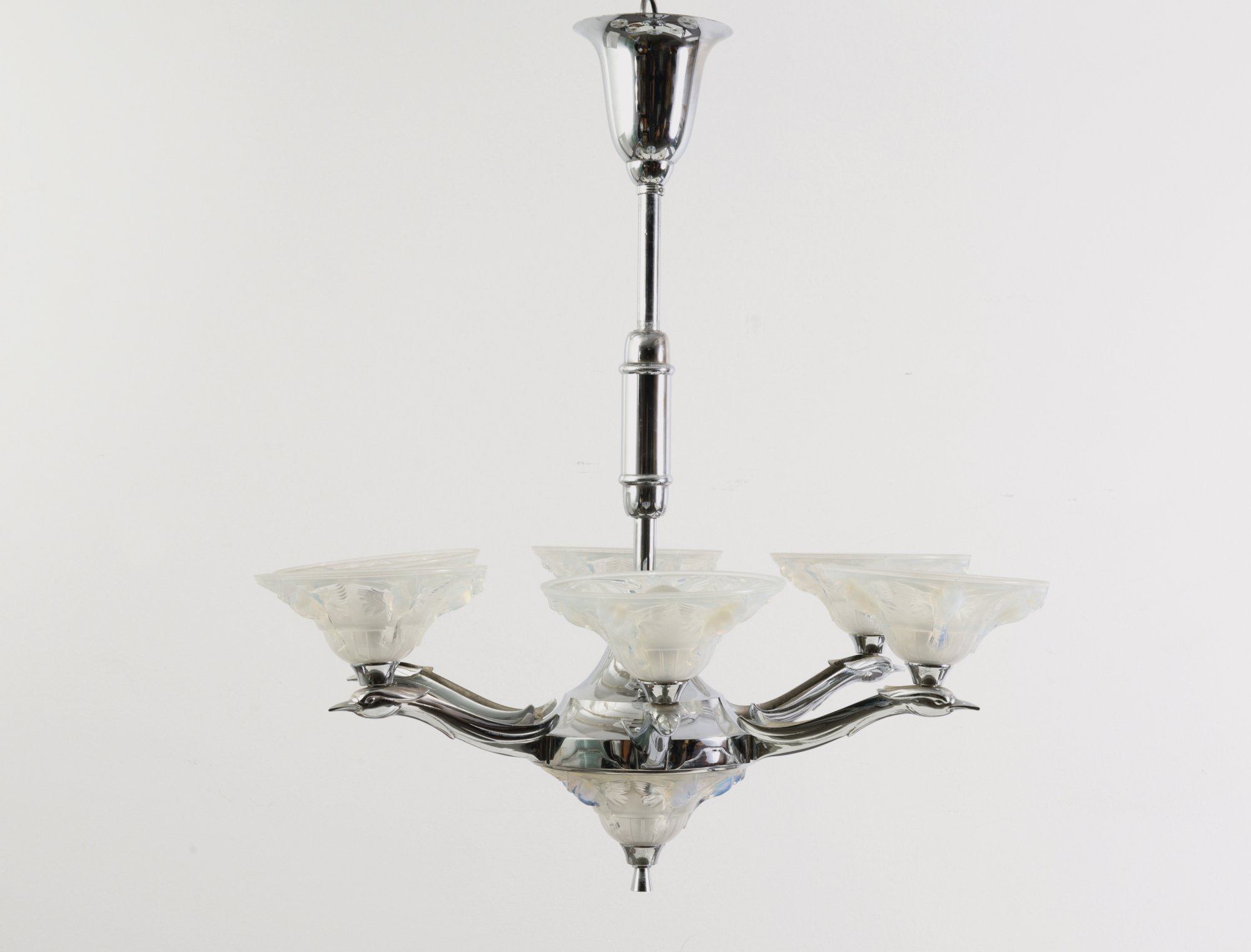 Verreries d'Ezanville. 'Birds' ceiling light, c1930. H. 70 cm, D. 78 cm. Chrome-plated metal, clear moulded glass with half plastic birds, slightly opaline, inside matted.