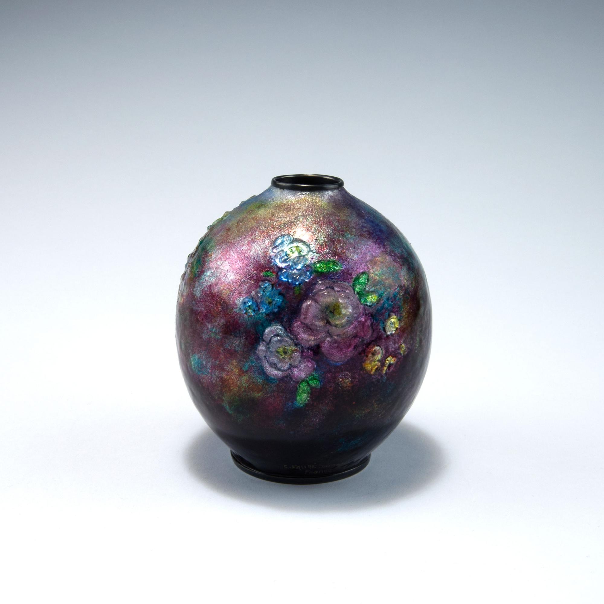 Camille Fauré, Limoges. Small vase, c1920. H. 10.9 cm. Silver-plated metal, applied metal foil, polychromatic enamel with roses. Signed: C. FAURÉ Limoges France.