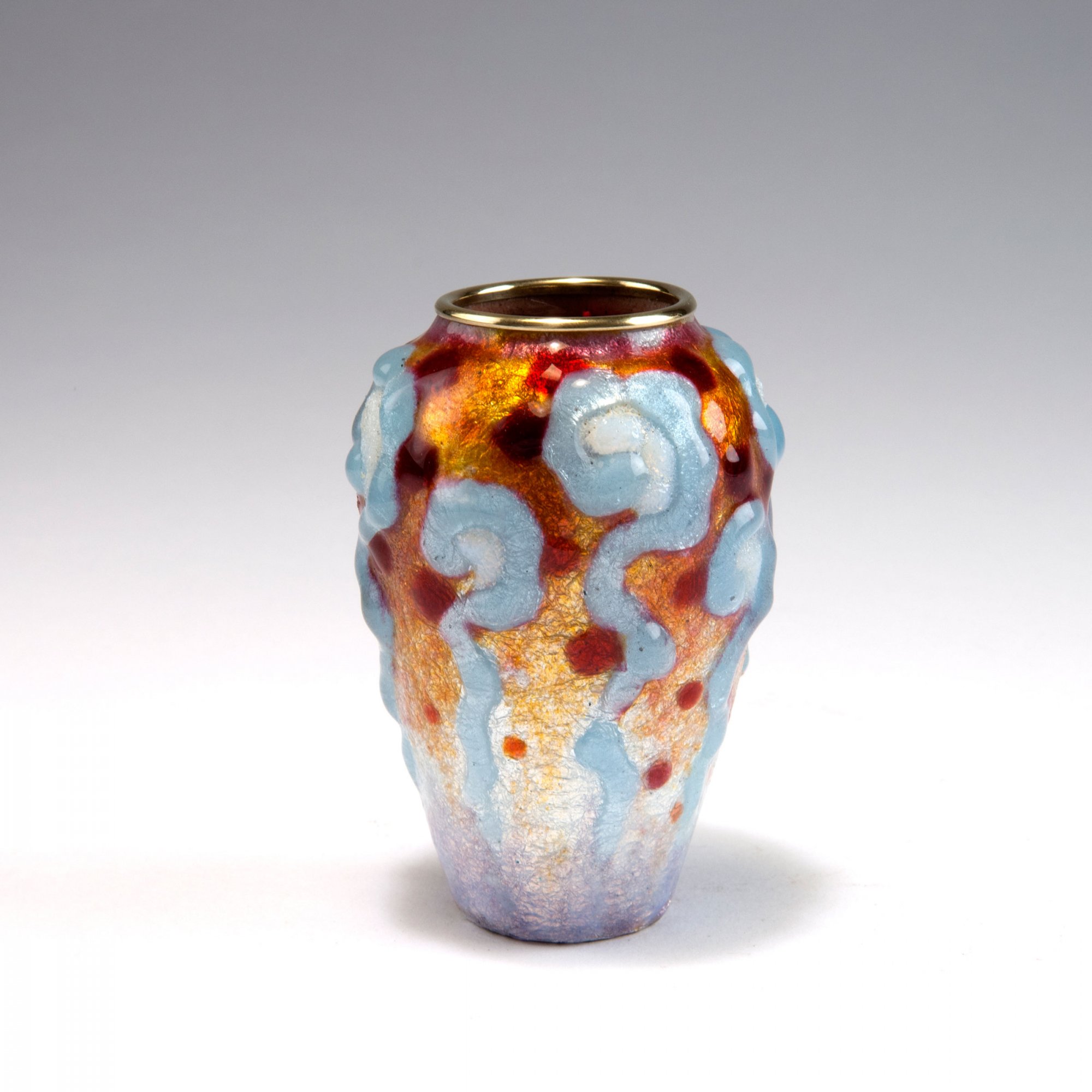Camille Fauré, Limoges. 'Volutes' vase, c1925. H. 9 cm. Copper, applied metal foil, polychromatic enamel. Brass rim. Signed: C. FAURÉ LIMOGES.