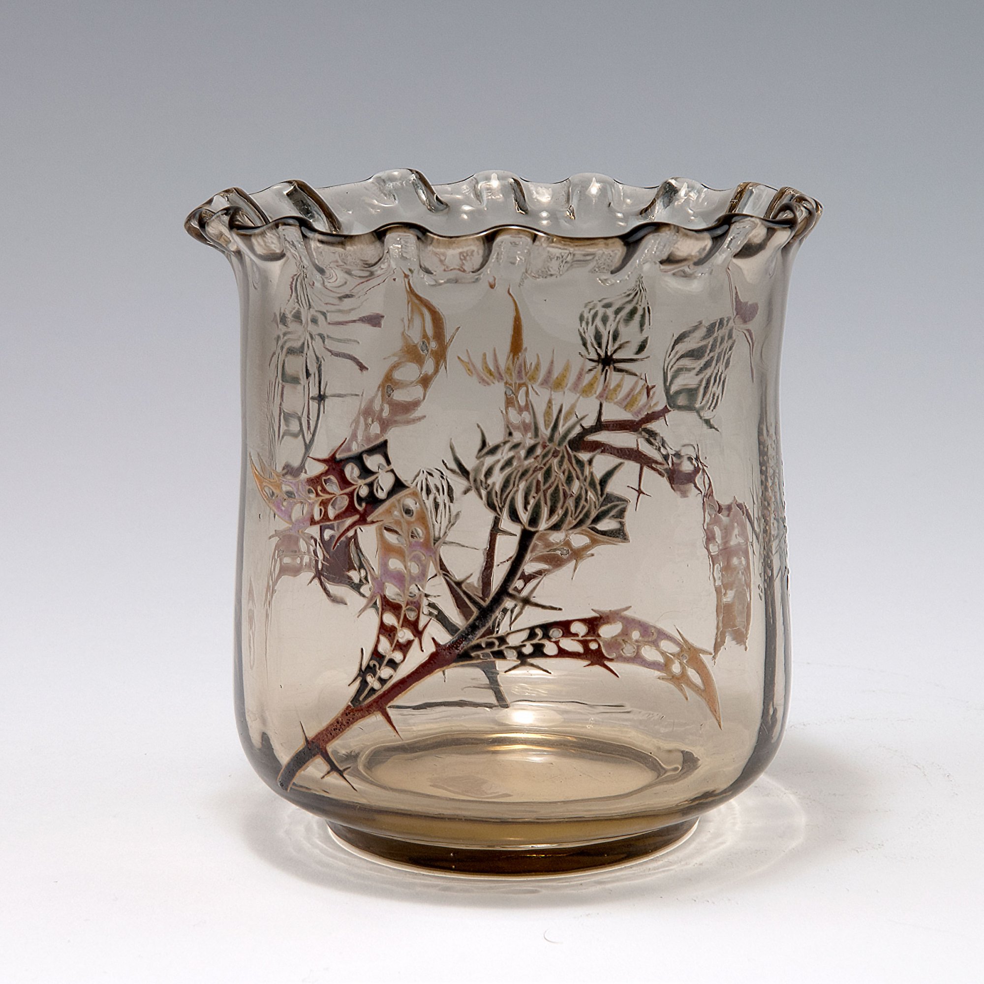 Emile Gallé, Nancy. 'Chardons' vase, c1890. H. 12.5 cm. Smoke coloured glass. Relief enamel, gold-hue. Thistles. Signed: E. Gallé, cross of Lorraine.