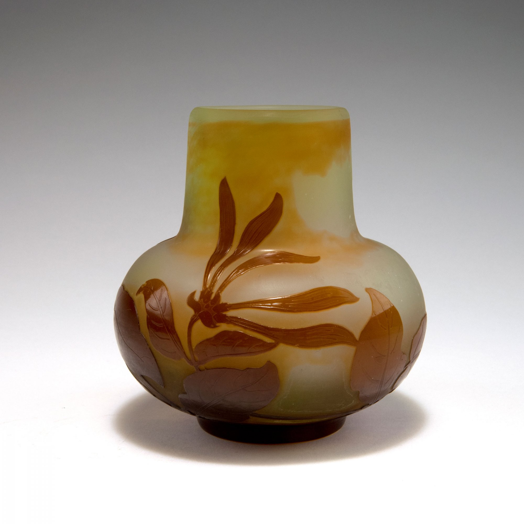 Emile Gallé, Nancy. 'Chèvre-feuille' vase, 1906-14. H. 14.2 cm. Cased glass, pale green, clear, amber and brown. Multiply etched pattern with honeysuckle. Signed: Gallé.