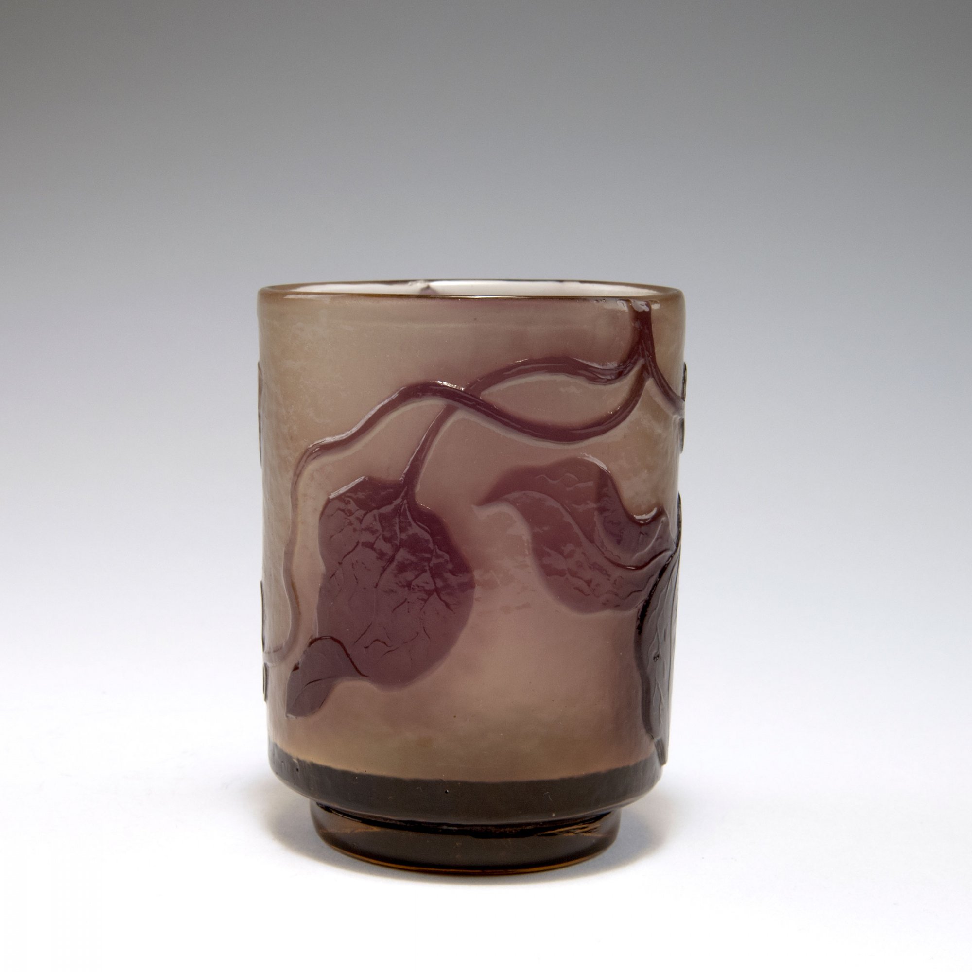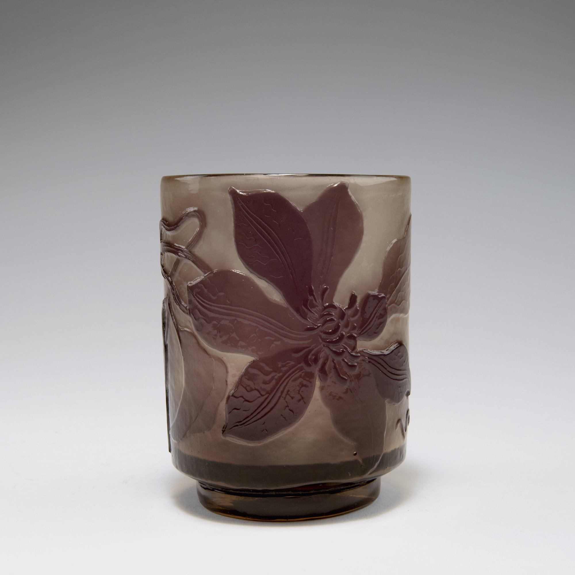 Emile Gallé, Nancy. 'Clématites' vase, c1898. H. 10.2 cm. Cased glass, clear, amber and purple. Etched pattern with clematis, polished. Signed: Gallé déposé.