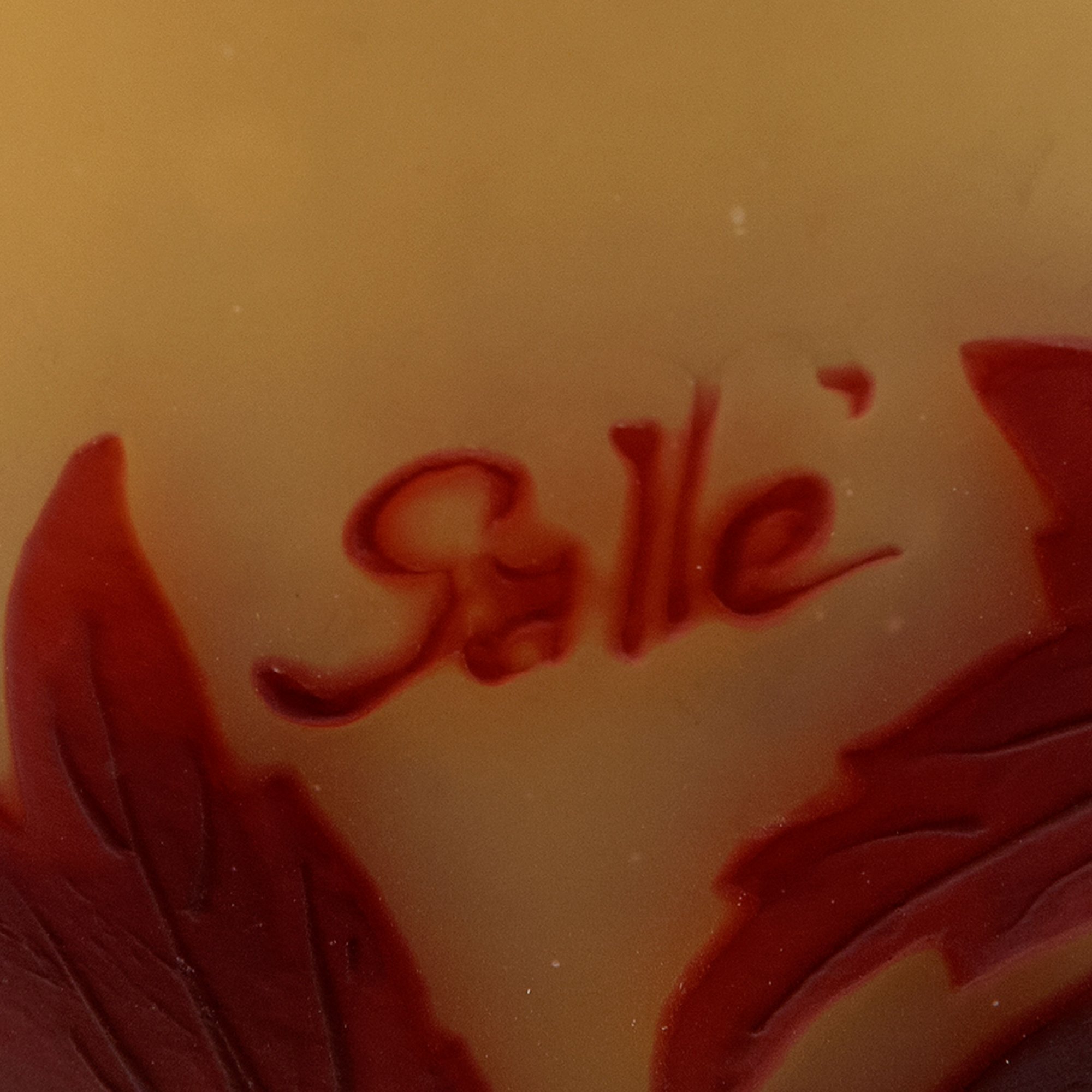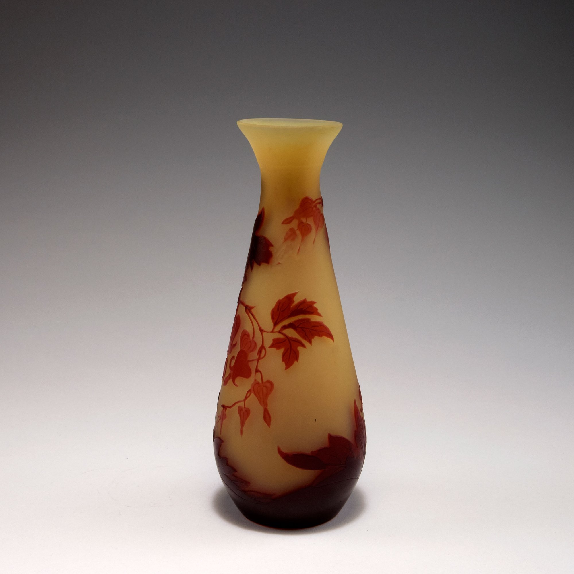 Emile Gallé, Nancy. 'Coeur de Jeanette' vase, 1906-14. H. 20 cm. Cased glass, clear, yellow and wine red. Multiply etched pattern with bleeding heart. Signed: Gallé.