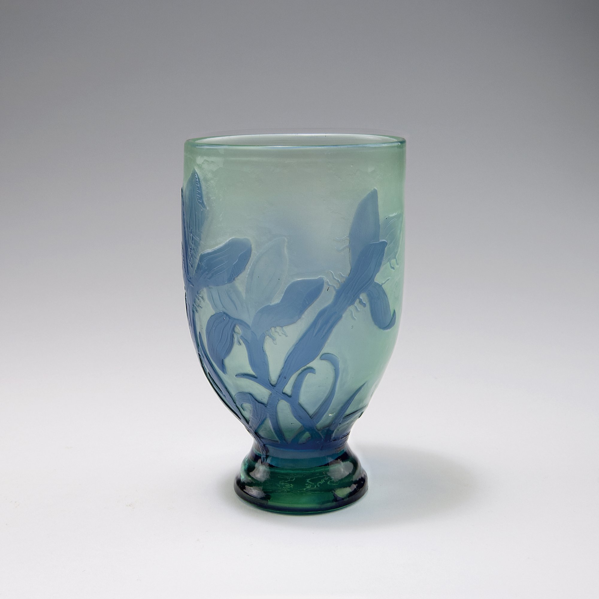Emile Gallé, Nancy. 'Crocus' vase, 1898. H. 16.2 cm. Cased glass, greenish, clear and blue. Multiply etched pattern with crocus. Inside matted. Signed: Gallé déposé.