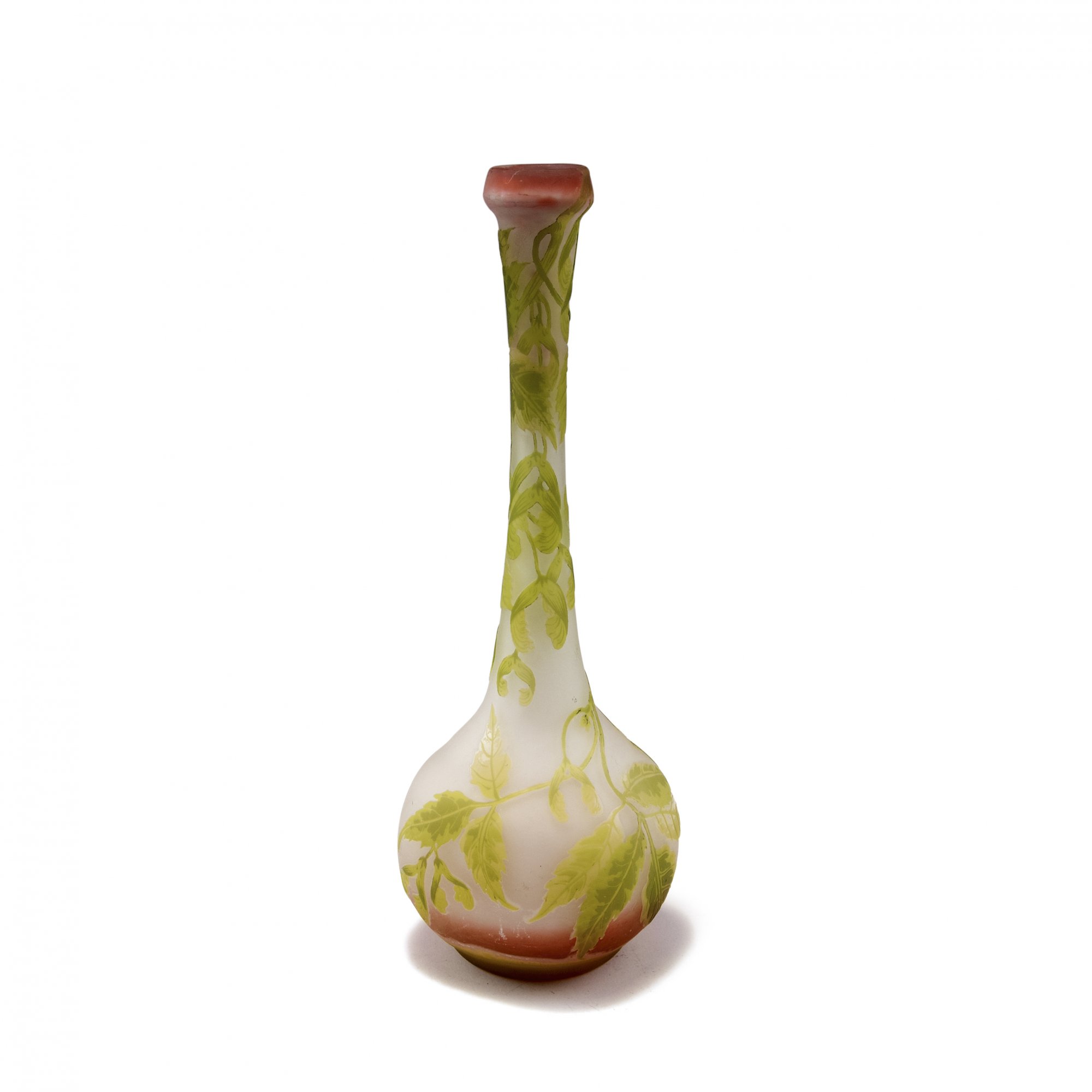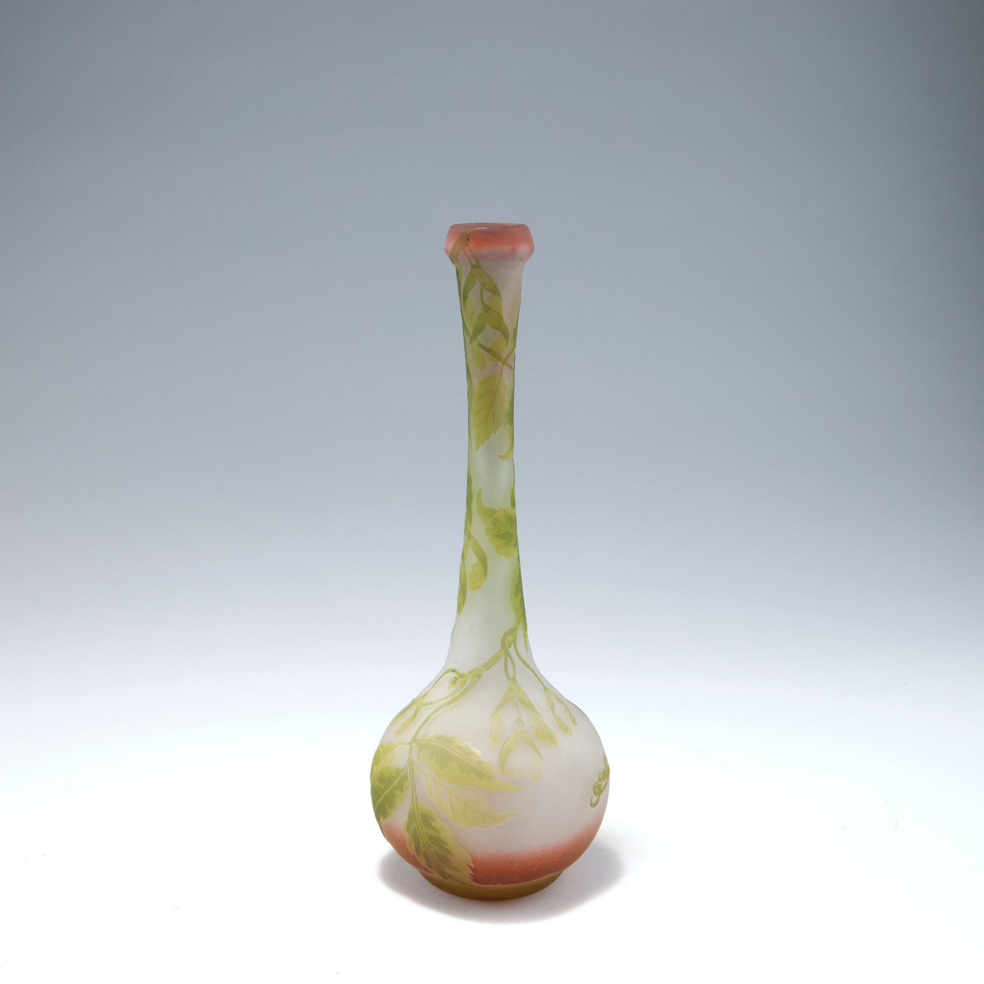 Emile Gallé, Nancy. 'Erable à feuilles de frêne' vase, 1904-06. H. 31.1 cm. Cased glass, pink, clear, pale and dark green. Multiply etched pattern with ash-leaved maple. Signed: Gallé.