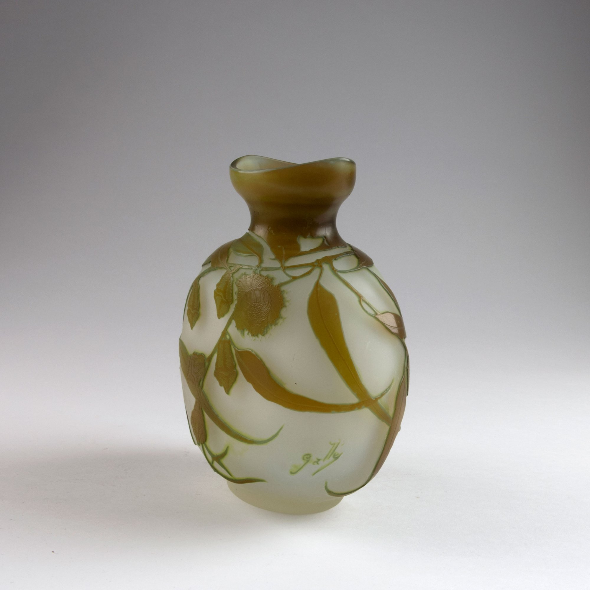 Emile Gallé, Nancy. 'Eucalyptus' vase, 1906-14. H. 21.5 cm. Cased glass, clear, olive green and amber. Multiply etched pattern with eucalyptus. Signed: Gallé.