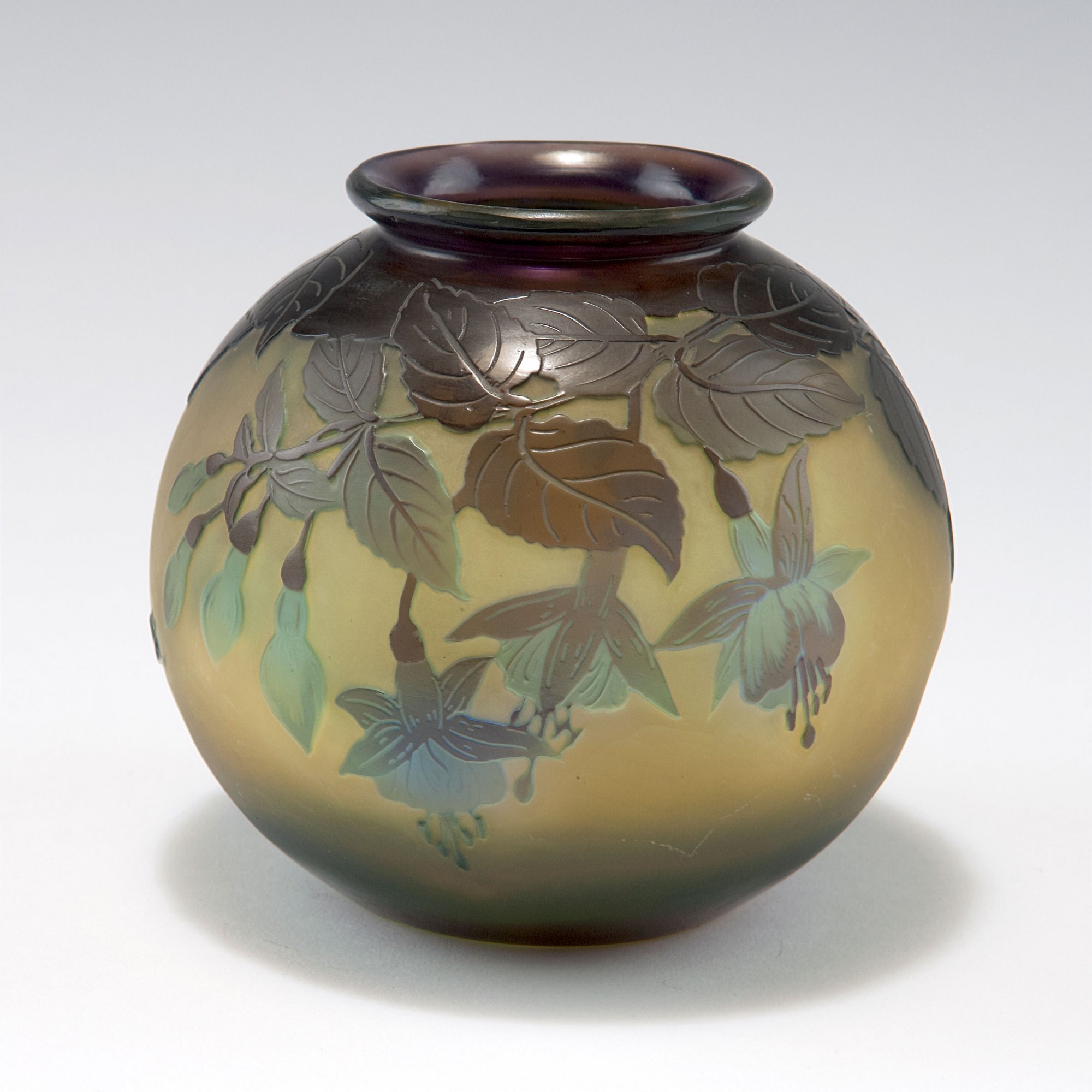 Emile Gallé, Nancy. 'Fuchsias' vase, 1920s. H. 11 cm. Cased glass, clear, yellow and blue. Multiply etched pattern with fuchsias. Signed: Gallé.