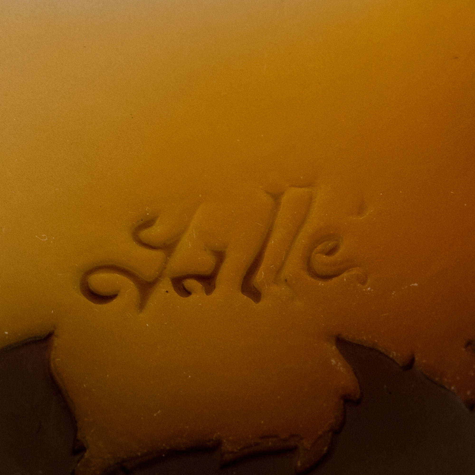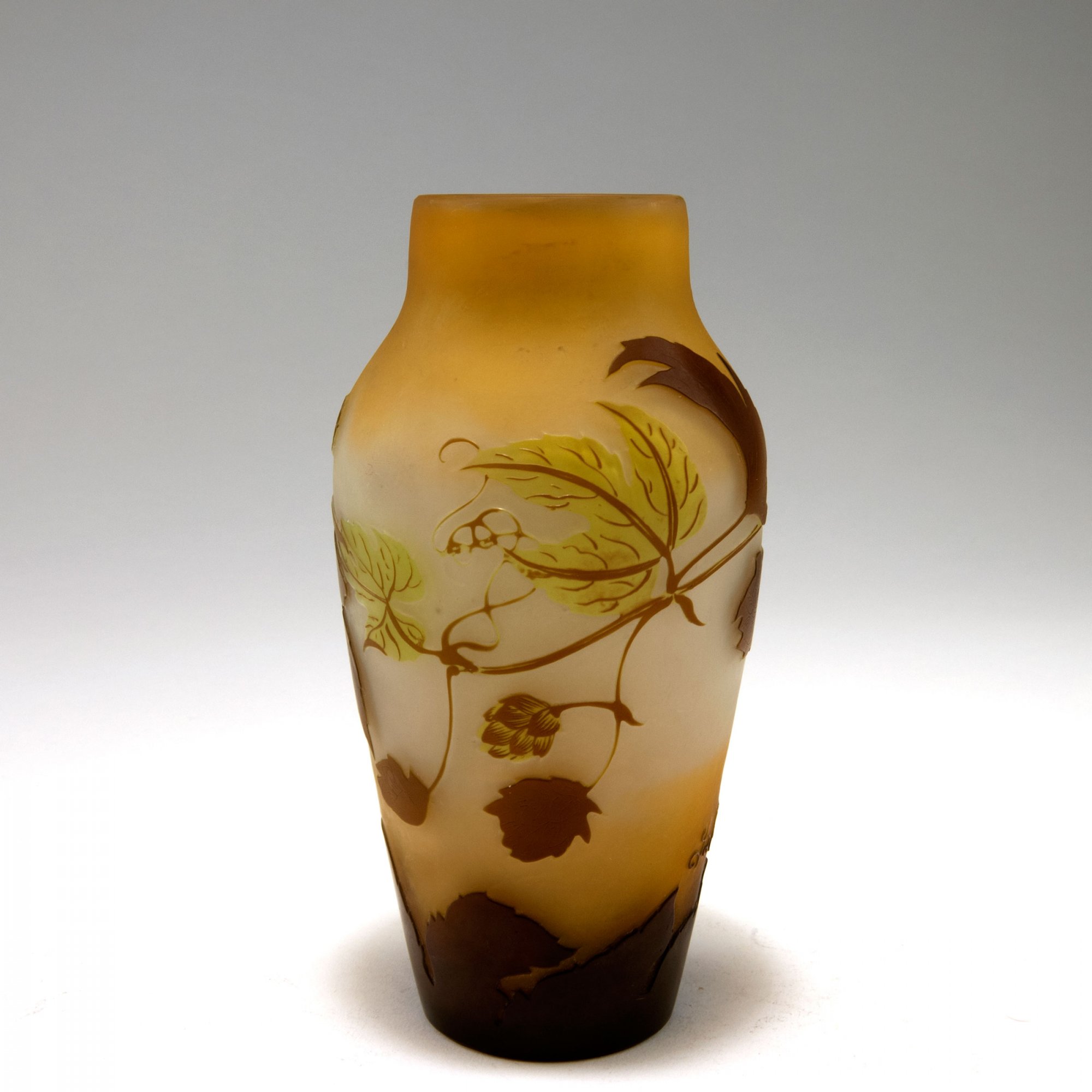 Emile Gallé, Nancy. 'Houblon' vase, 1906-14. H. 18.6 cm. Cased glass, clear, green and brown. Multiply etched pattern with hop. Signed: Gallé.