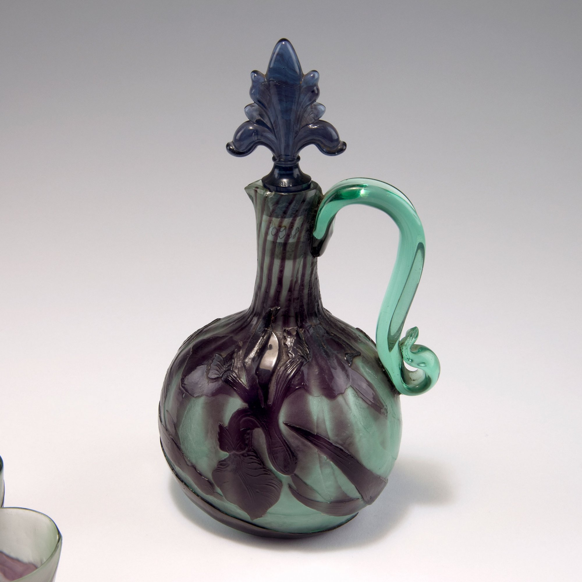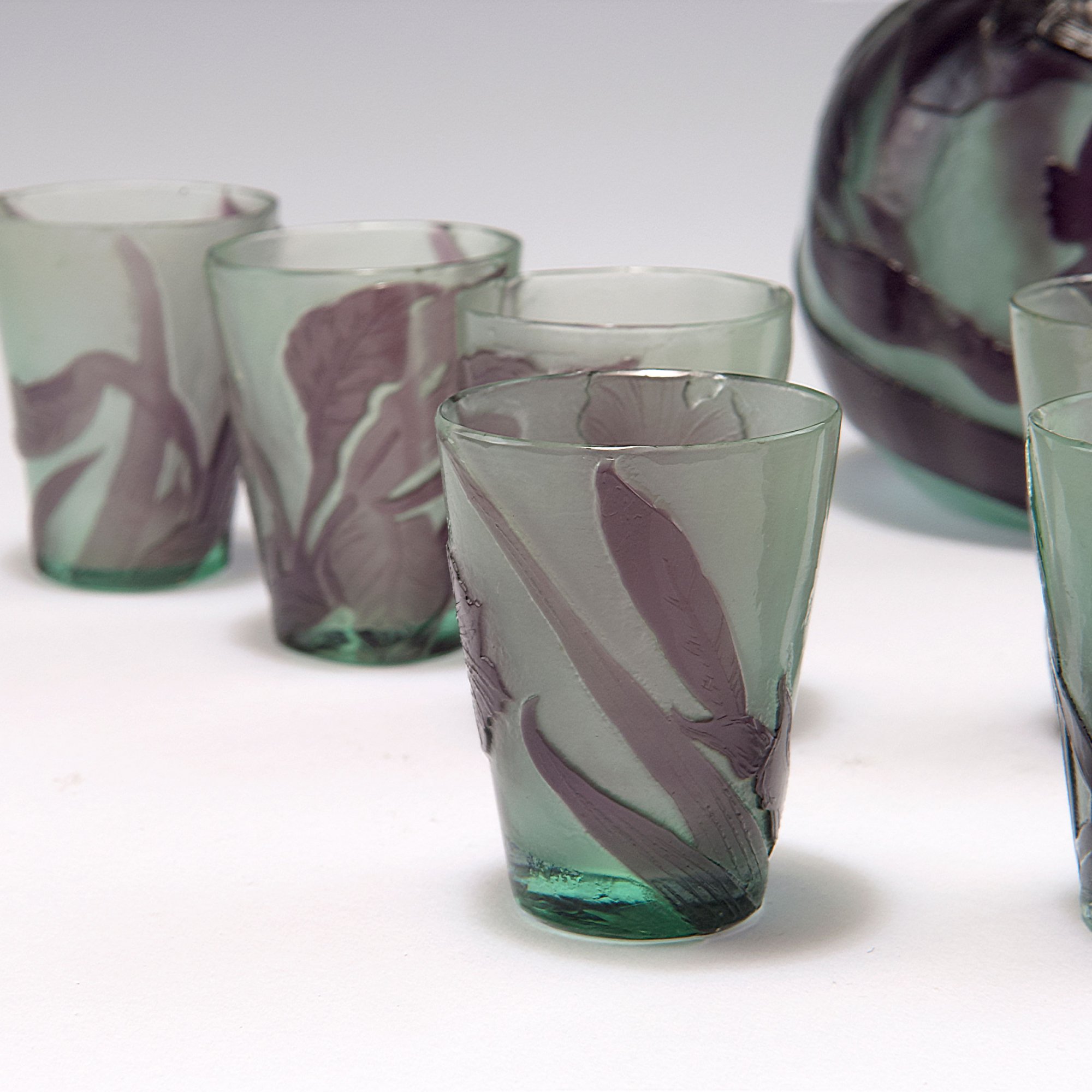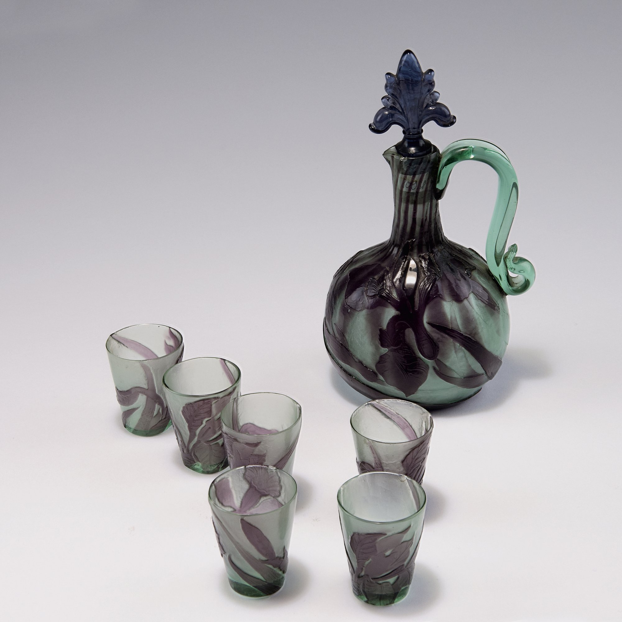 Emile Gallé, Nancy. 'Iris' liquor set, c1900. Flask, H. 20 cm; 6 tumblers, H. 5 cm. Cased glass, clear, green and purple, optical ribs. Multiply etched pattern with lilies. Stopper purple, handle green. Signed: Gallé.