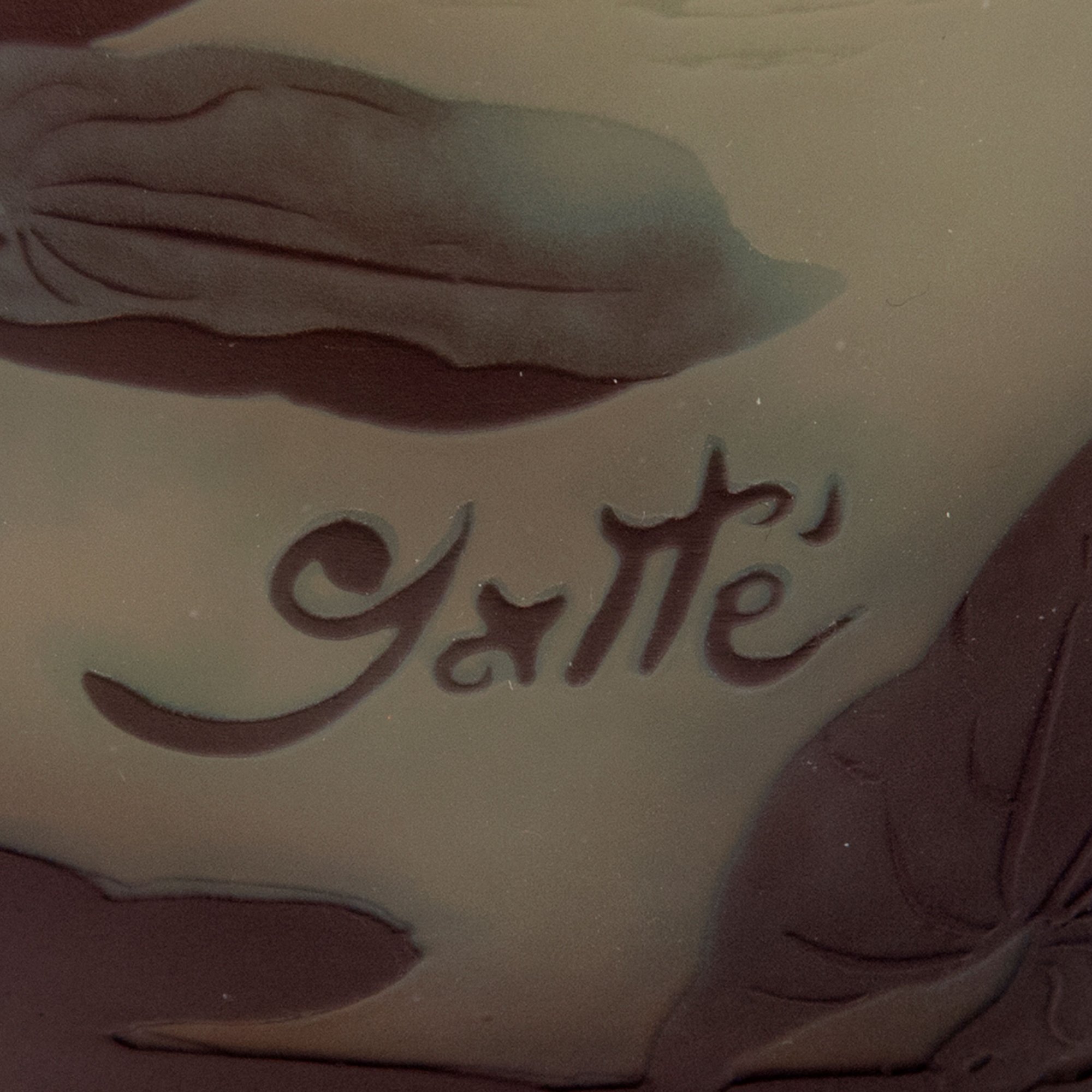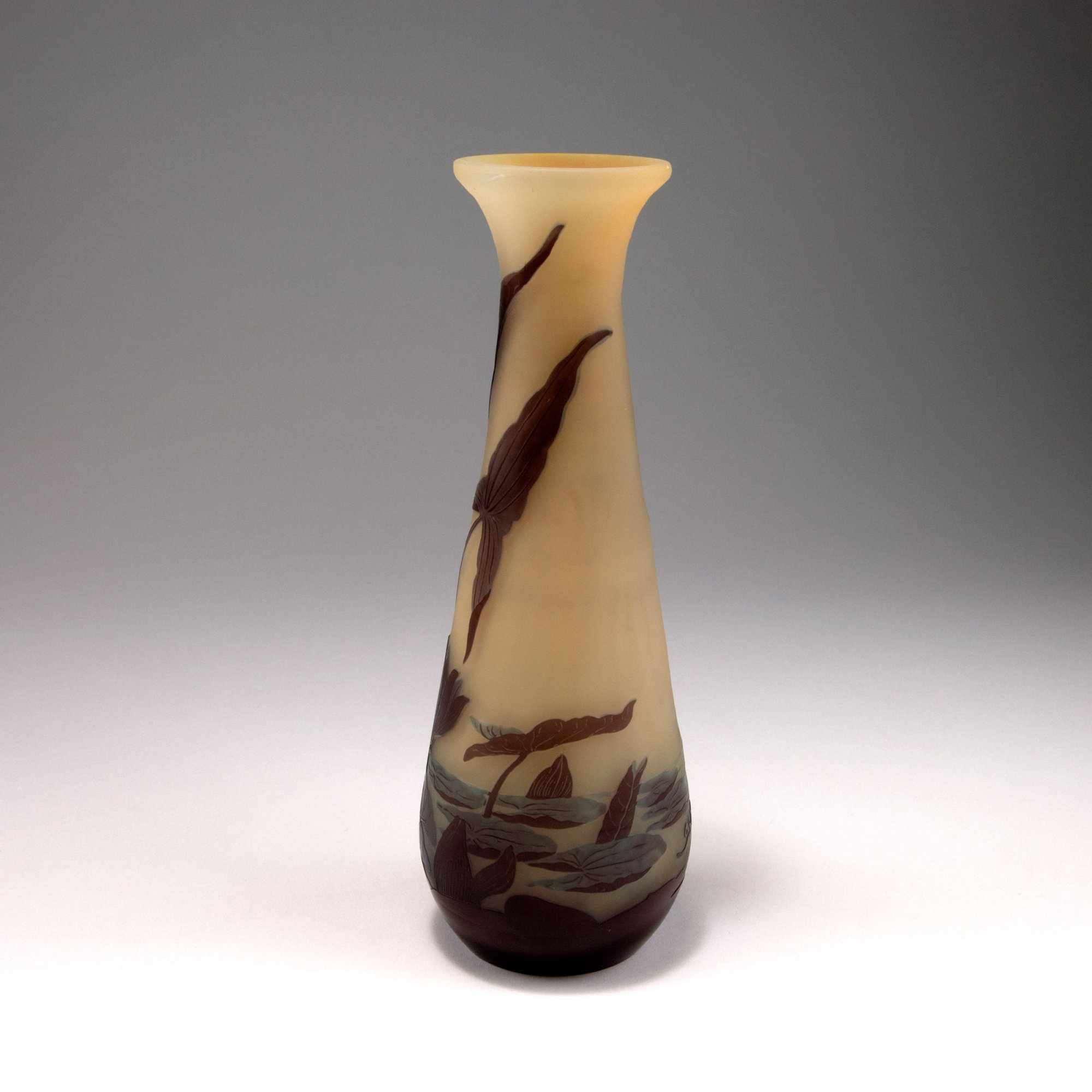 Emile Gallé, Nancy. 'Nénuphars et sagittaire' vase, 1906-14. H. 25 cm. Cased glass, clear, pale amber, blue and purple. Multiply etched pattern with pond with water lilies and arrowhead at sunset. Signed: Gallé.